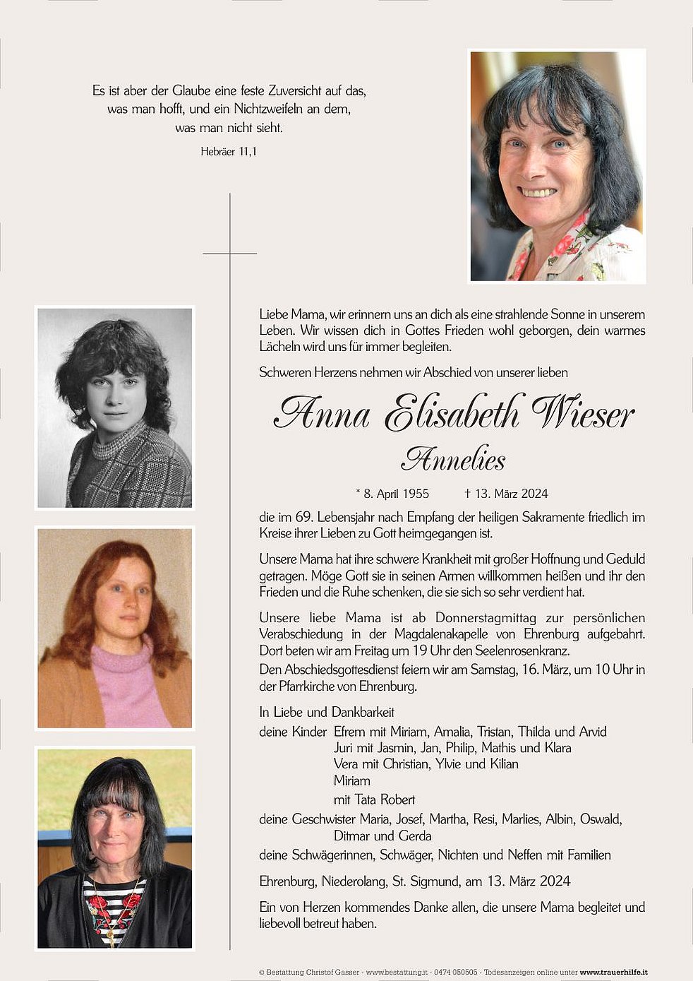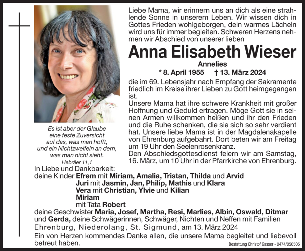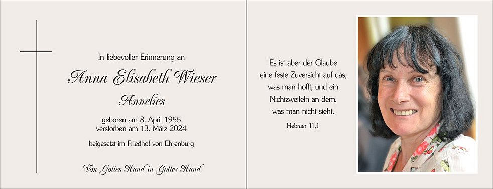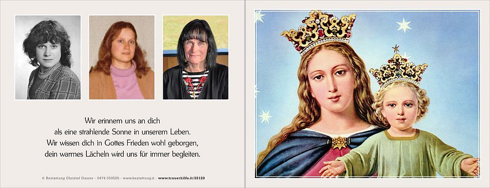 Liebe Mama, wir erinnern uns an dich als eine strahlende Sonne in unserem Leben. Wir wissen dich in Gottes Frieden wohl geborgen, dein warmes Lächeln wird uns für immer begleiten.