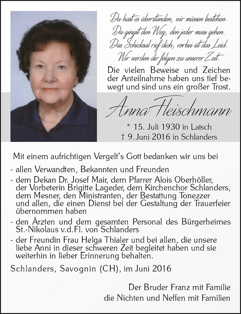 * 15.7.1930 in Latsch † 9.6.2016 in Schlanders