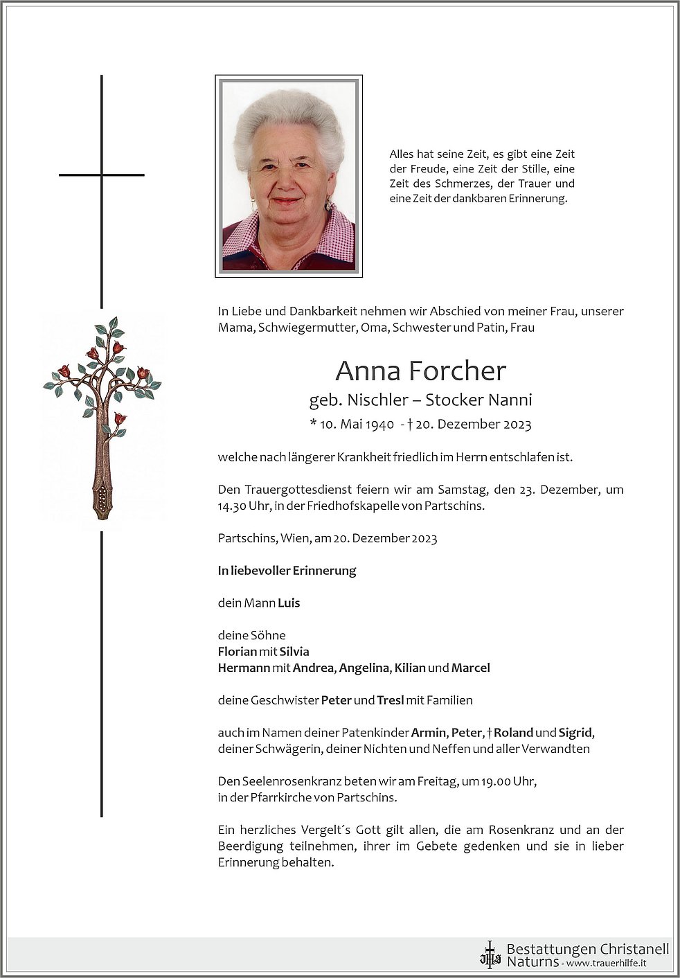 Den Trauergottesdienst feiern wir am Samstag, den 23. Dezember, um 14.30 Uhr, in der Friedhofskapelle von Partschins.