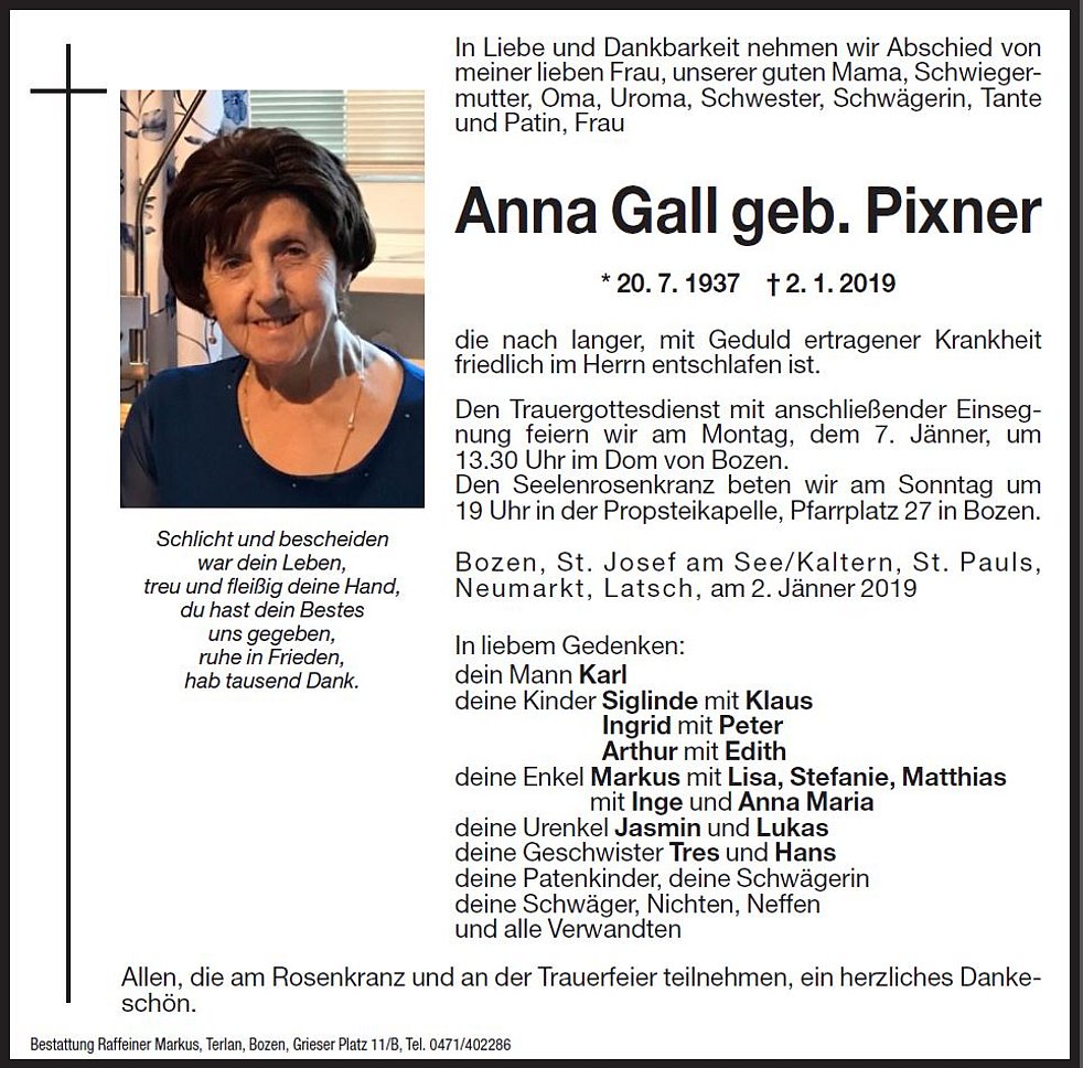 Den Trauergottesdienst mit anschlieβender Einsegnung feiern wir am Montag, dem 7. Jänner, um 13.30 Uhr im Dom von Bozen.