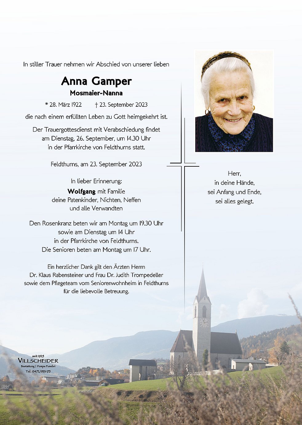 Begräbnisgottesdienst: 26.09. - 14:30 Uhr Feldthurns