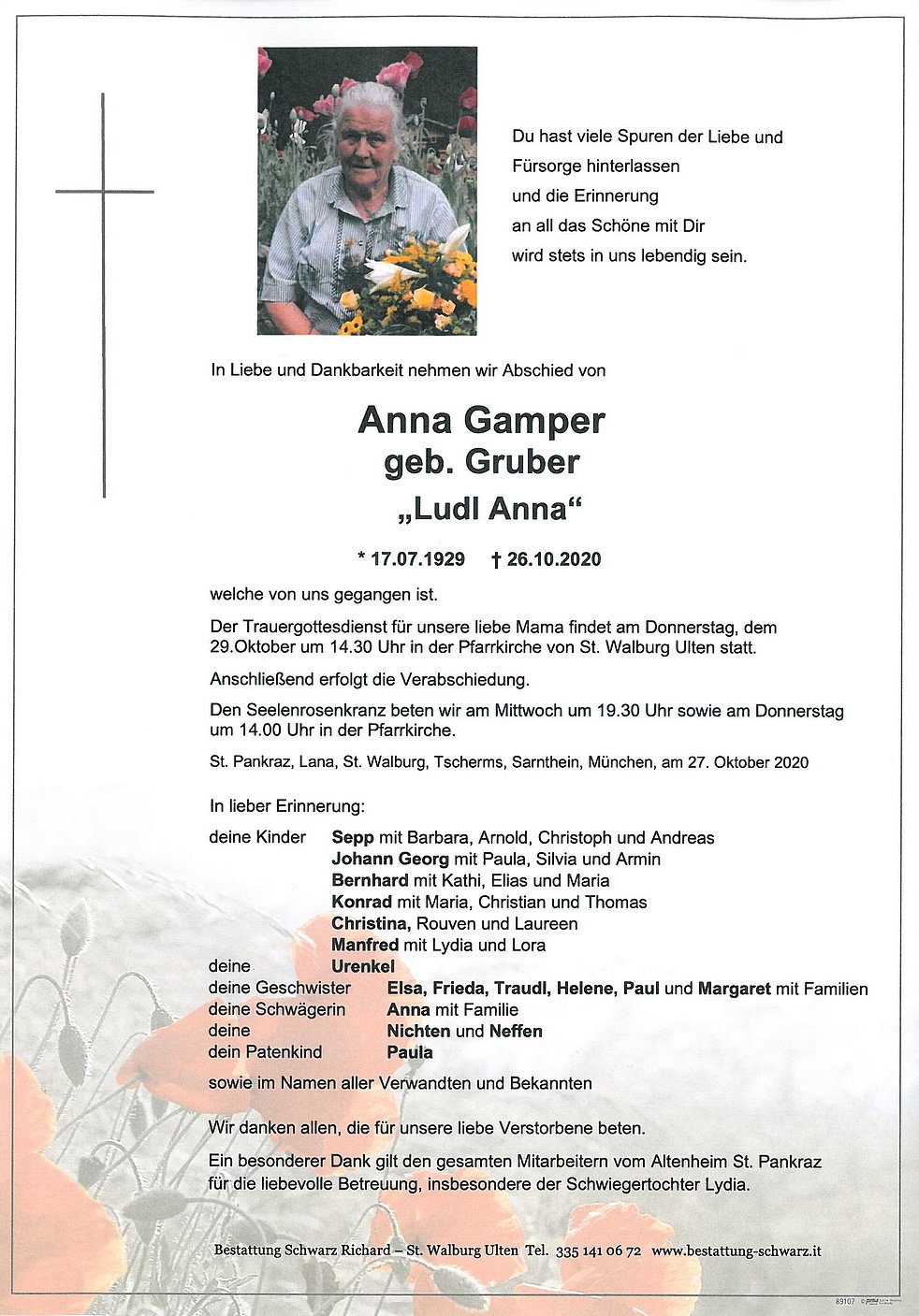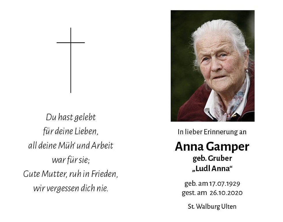 Möge Frau Gamper, die Ludl Anna in Gottes unendlicher Bamherzigkeit und Liebe ruhen im ewigen Frieden. Den Angehörigen wünsche ich viel Kraft, Zuversicht und den Glauben an die Gewissheit des Wiedersehens in einer anderen Welt.