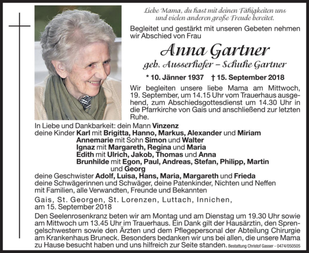 Wir begleiten unsere liebe Mama am Mittwoch, 19. September, um 14.15 Uhr vom Trauerhaus ausgehend, zum Abschiedsgottesdienst um 14.30 Uhr in die Pfarrkirche von Gais und anschließend zur letzten Ruhe.