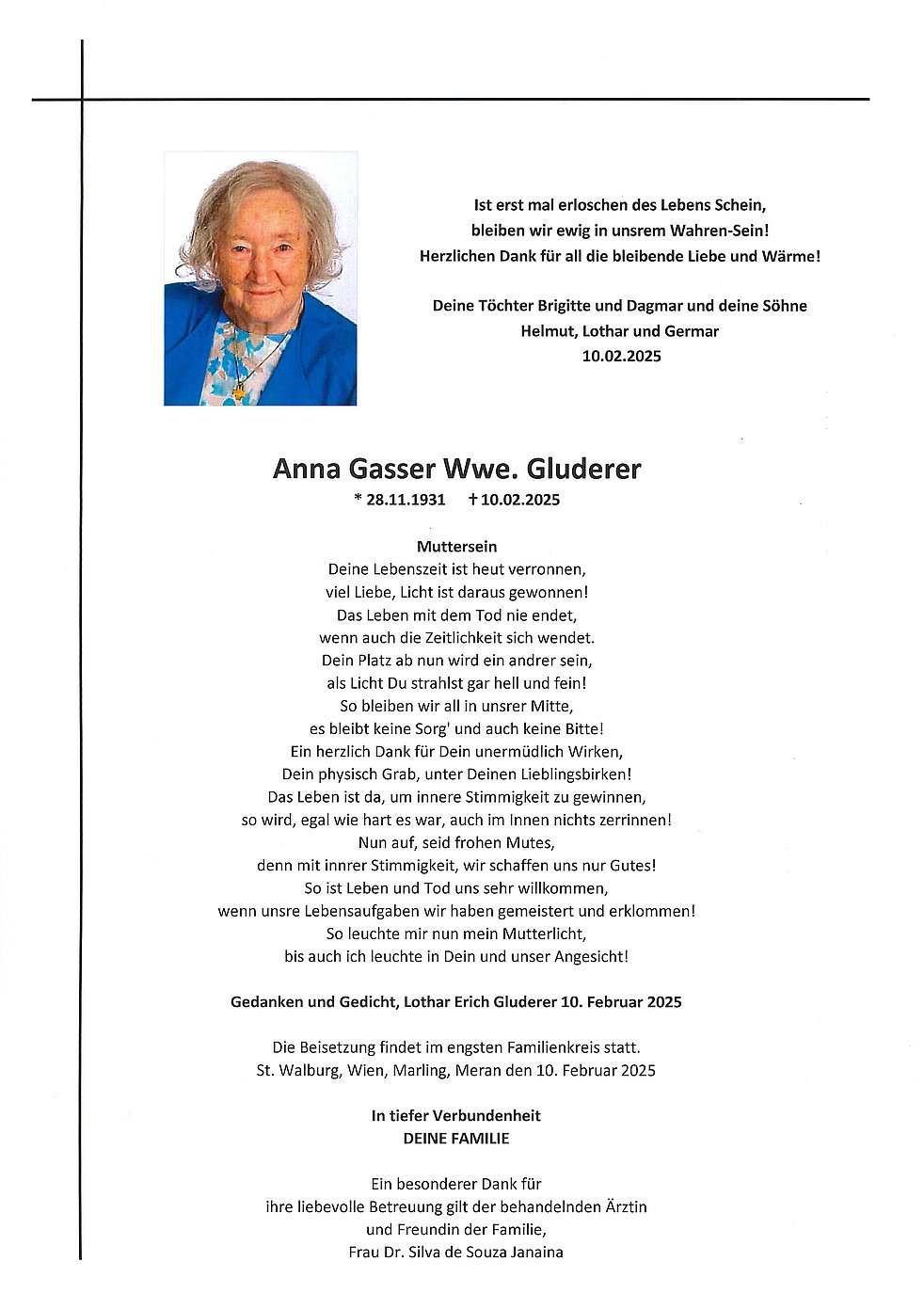 Gedanken und Gedicht, Lothar Erich Gluderer 10. Februar 2025