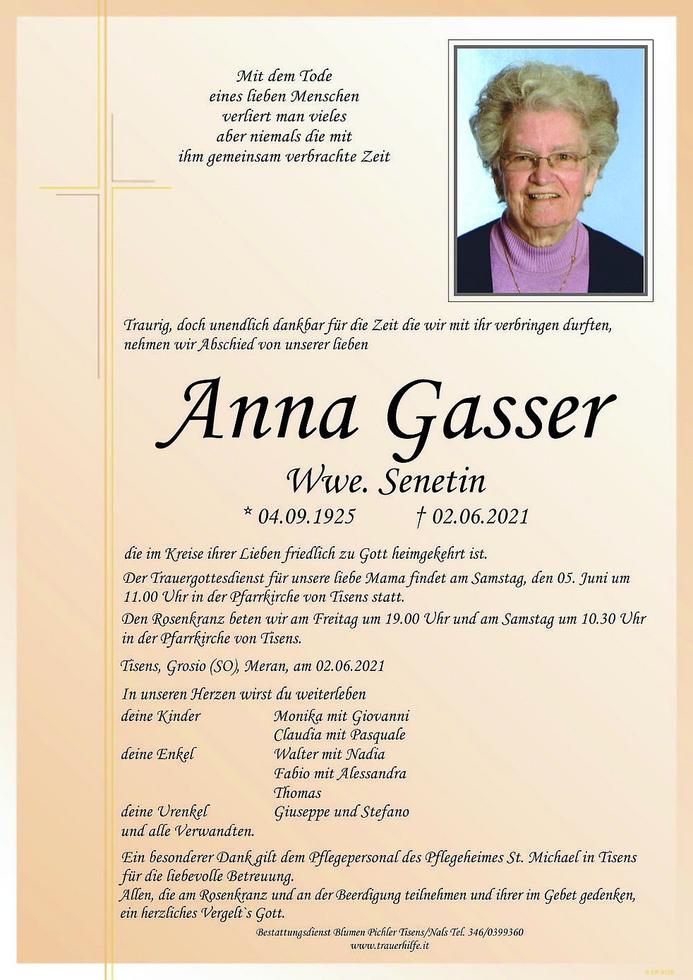 Bestattungsdienst Blumen Pichler Tisens/Nals Tel. 346/0399360