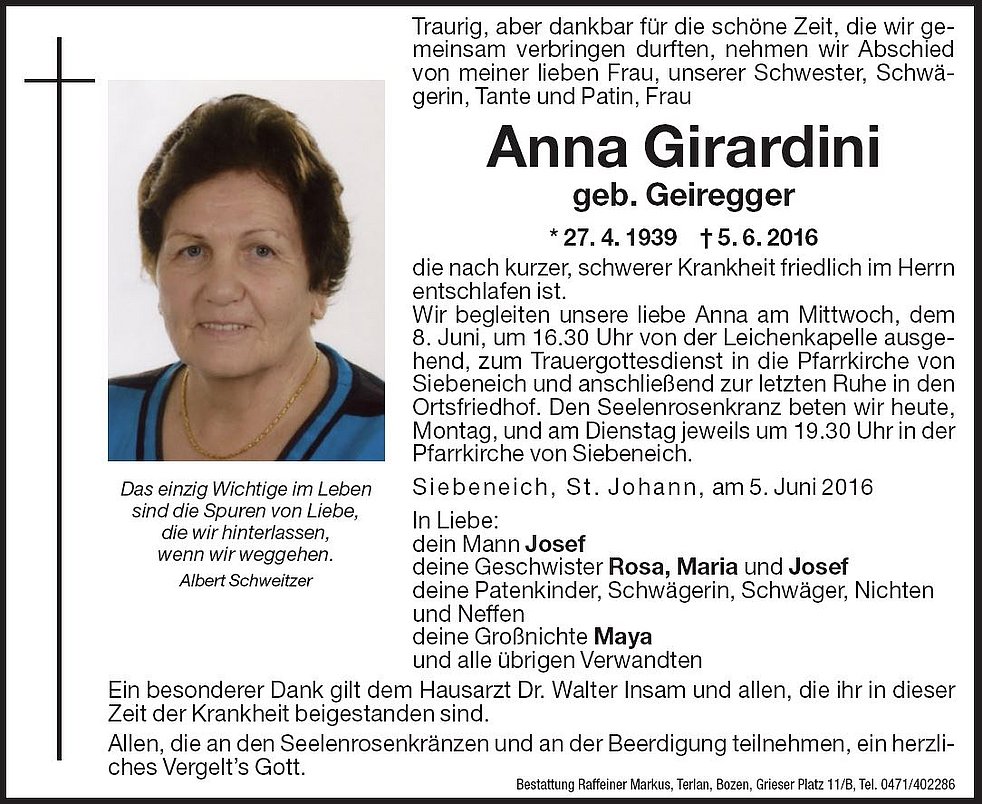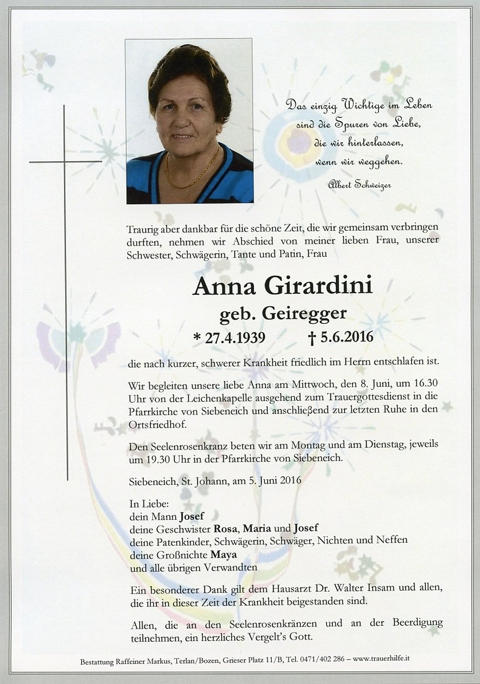 Wir begleiten unsere liebe Anna am Mittwoch, den 8. Juni, um 16.30 Uhr von der Leichenkapelle ausgehend zum Trauergottesdienst in die Pfarrkirche von Siebeneich und anschlieβend zur letzten Ruhe in den Ortsfriedhof.