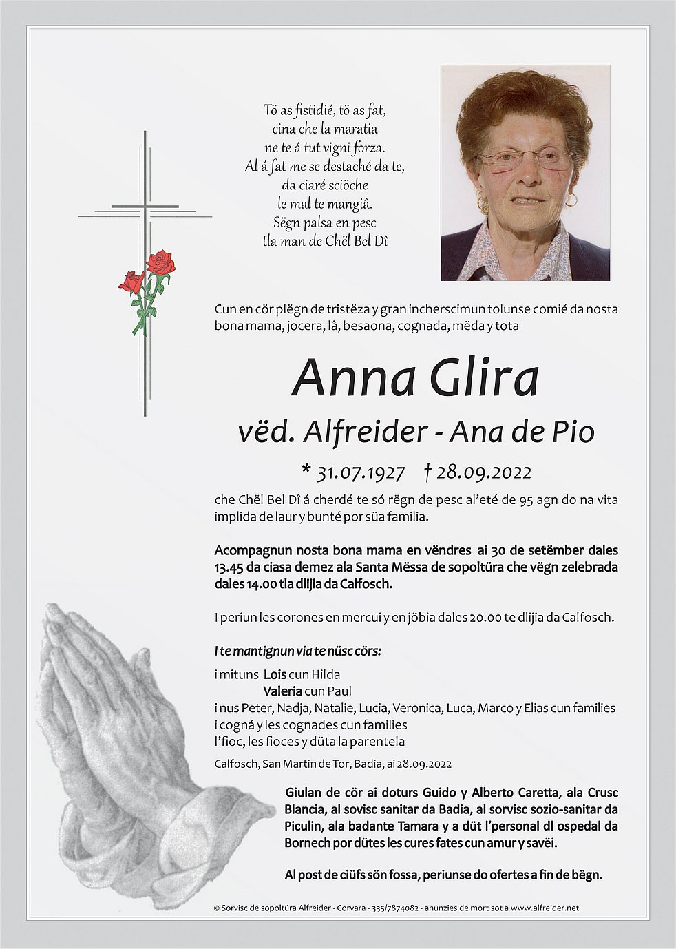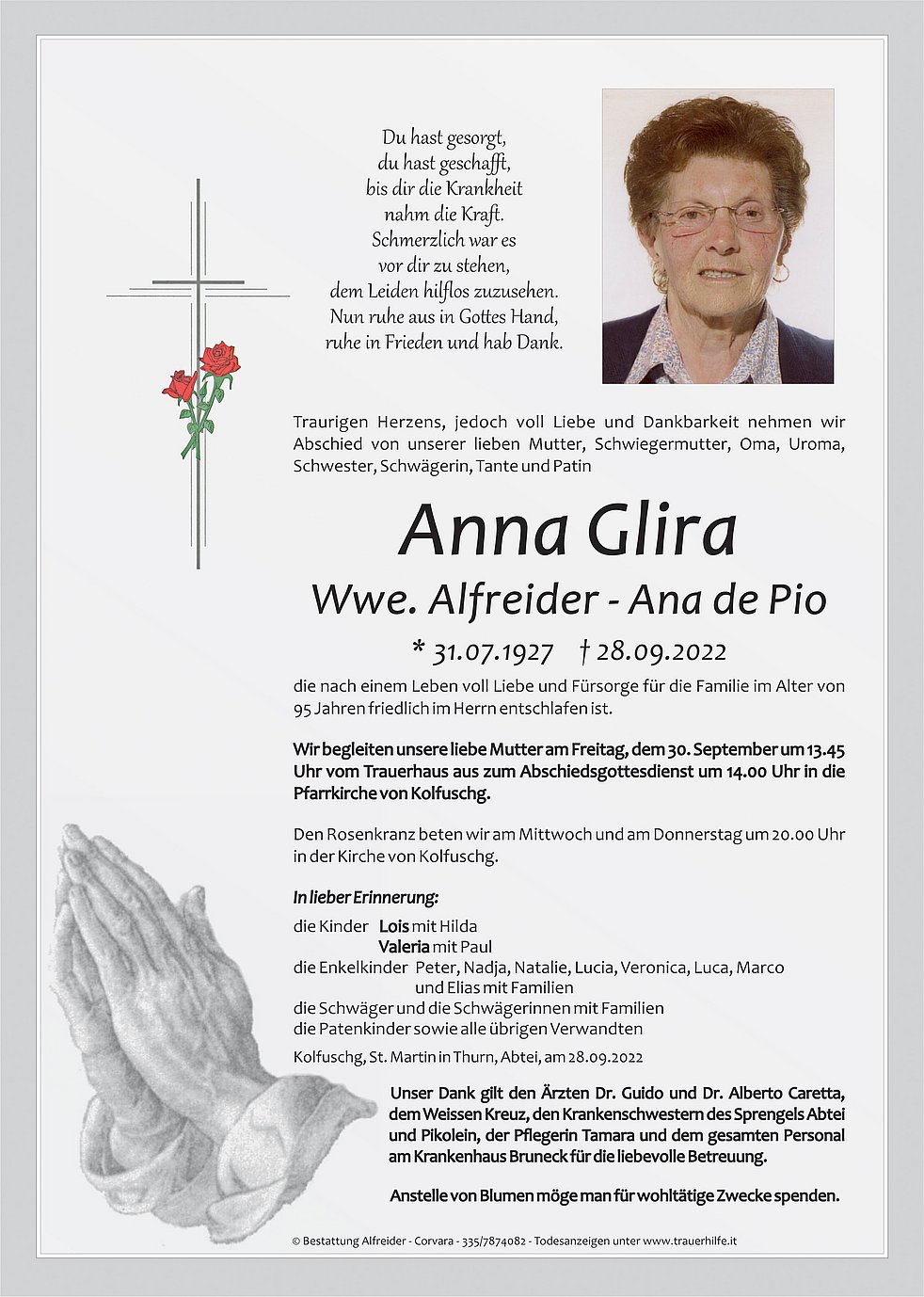 Wir begleiten unsere liebe Mutter am Freitag, dem 30. September um 13.45 Uhr vom Trauerhaus aus zum Abschiedsgottesdienst um 14.00 Uhr in die Pfarrkirche von Kolfuschg.