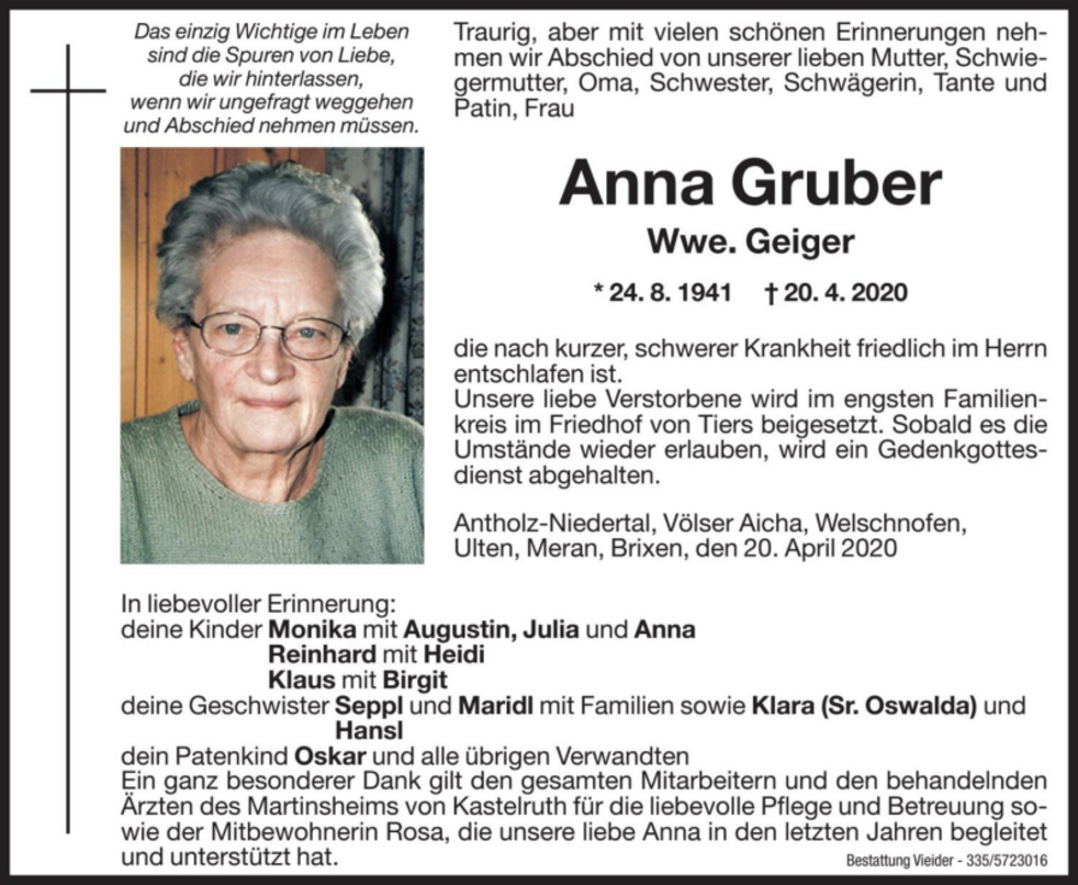 Ein ganz besonderer Dank gilt den gesamten Mitarbeitern und den behandelnden Ärzten des Martinsheims von Kastelruth für die liebevolle Pflege und Betreuung, sowie der Mitbewohnerin Rosa, die unsere liebe Anna in den letzten Jahren begleitet und unterstützt hat.