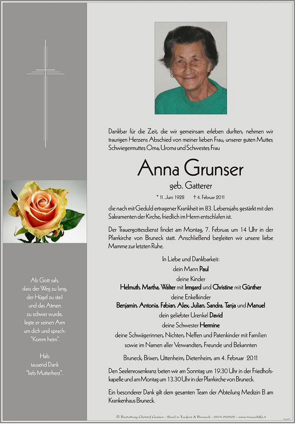 Der Trauergottesdienst findet am Montag, 7. Februar, um 14 Uhr in der Pfarrkirche von Bruneck statt. Anschließend begleiten wir unsere liebe Mamme zur letzten Ruhe.