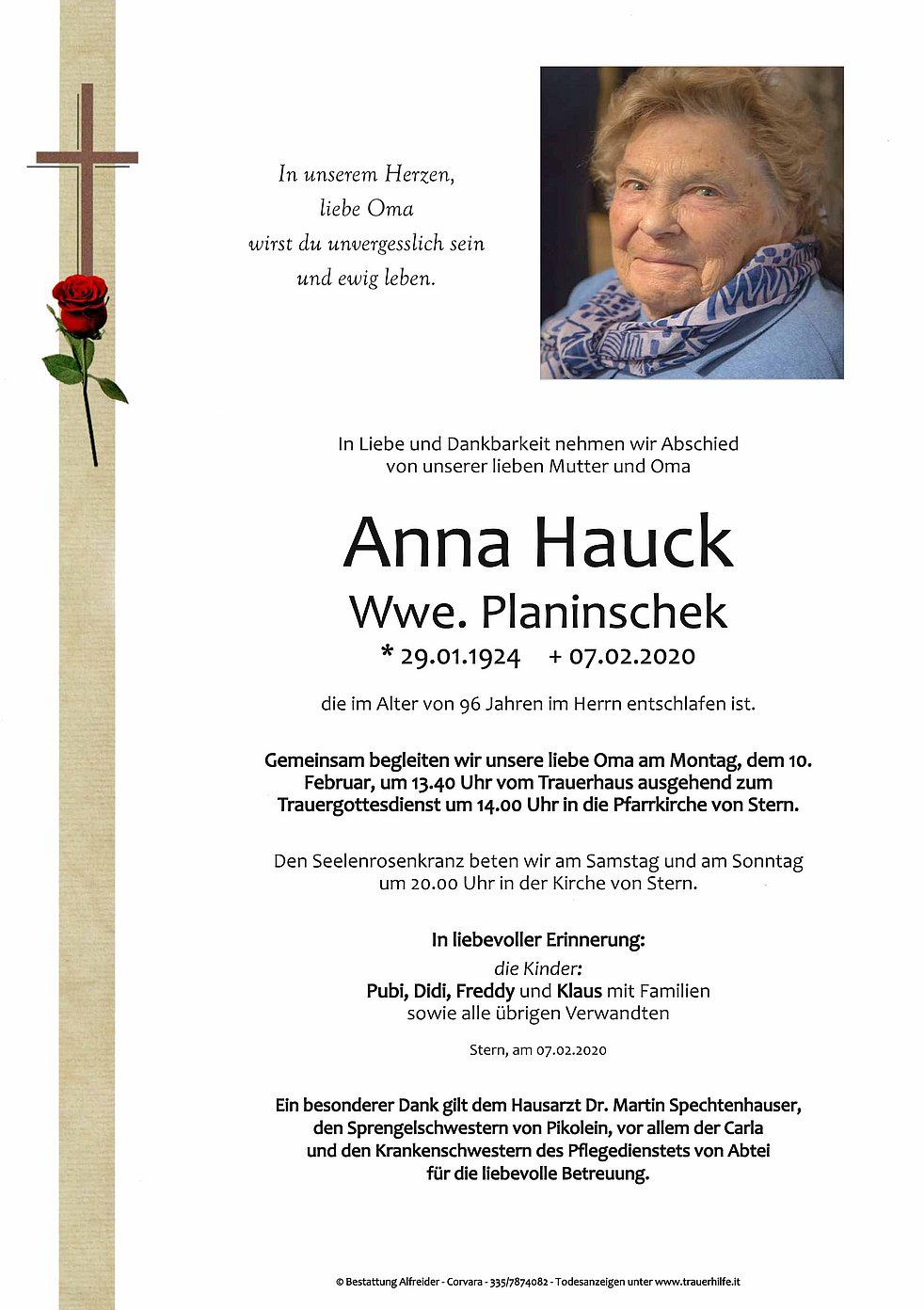 Gemeinsam begleiten wir unsere liebe Oma am Montag, dem 10. Februar, um 13.40 Uhr vom Trauerhaus ausgehend zum Trauergottesdienst um 14.00 Uhr in die Pfarrkirche von Stern.