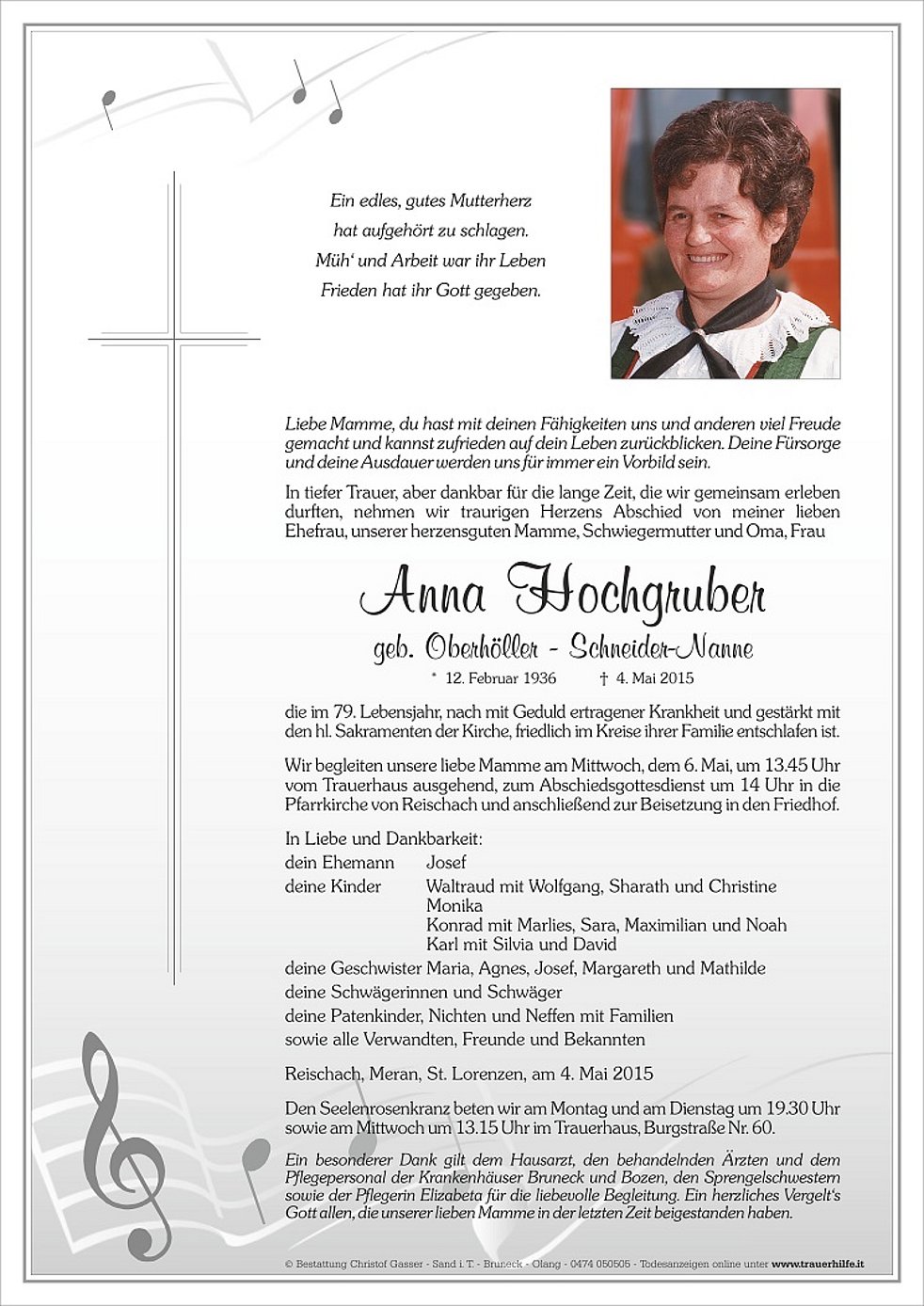 Ein besonderer Dank gilt dem Hausarzt, den behandelnden Ärzten und dem Pflegepersonal der Krankenhäuser Bruneck und Bozen, den Sprengelschwestern sowie der Pflegerin Elizabeta für die liebevolle Begleitung. Ein herzliches Vergelt‘s Gott allen, die unserer lieben Mamme in der letzten Zeit beigestanden haben.