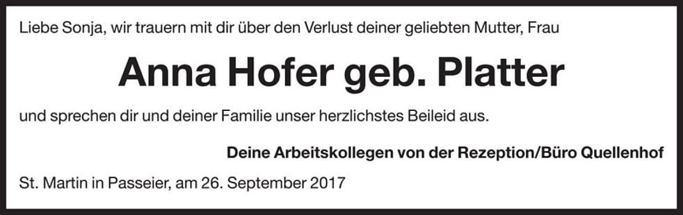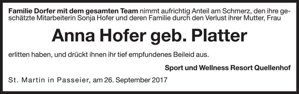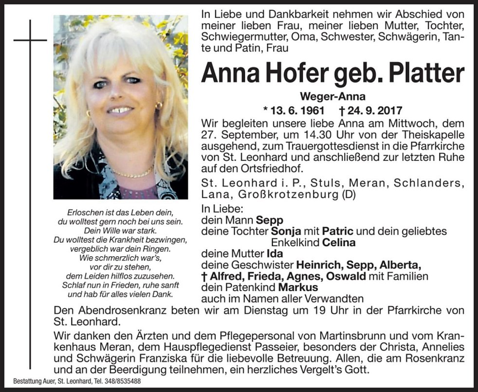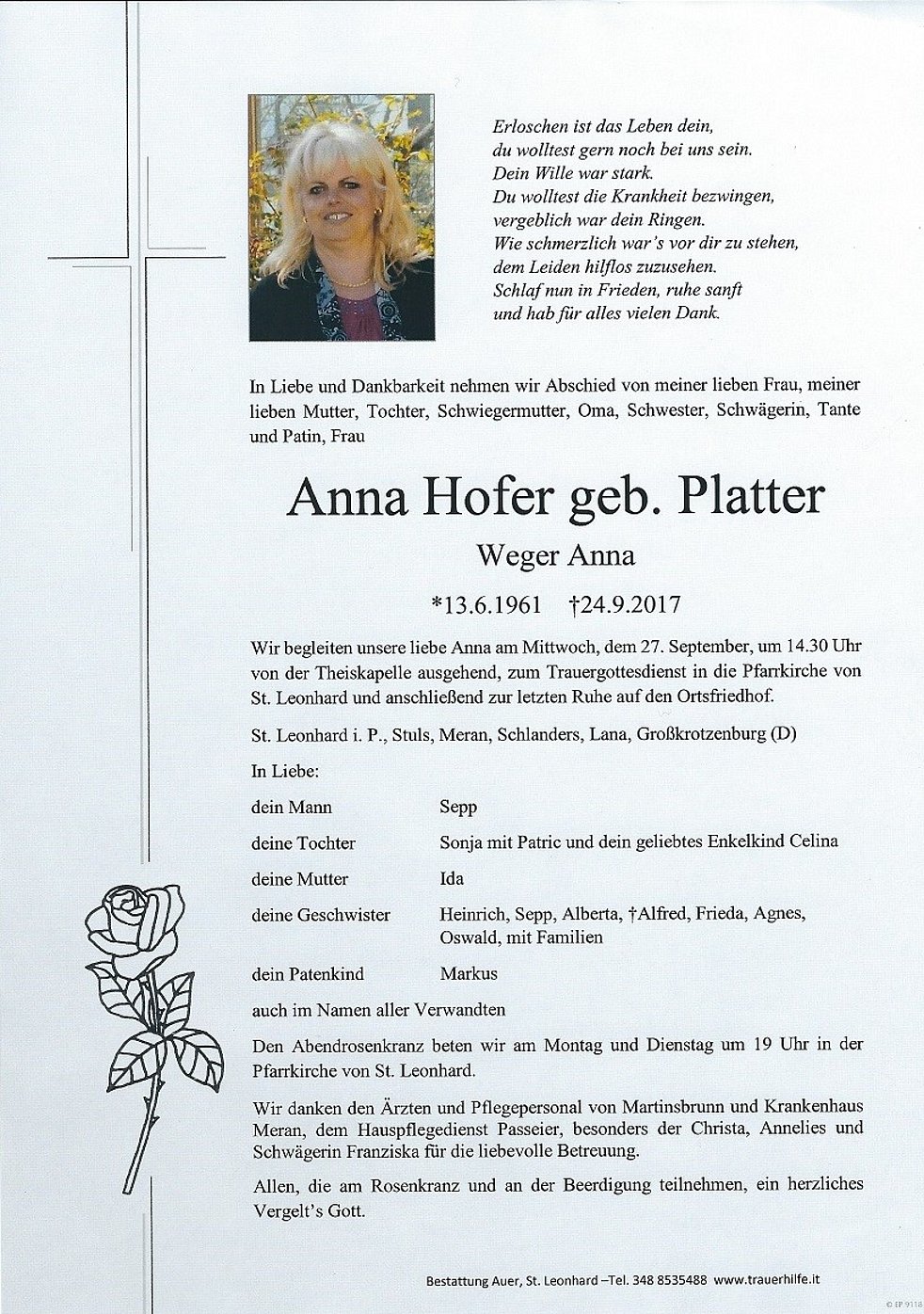 Wir begleiten unsere liebe Anna am Mittwoch, dem 27. September, um 14.30 Uhr von der Theiskapelle ausgehend, zum Trauergottesdienst in die Pfarrkirche von St. Leonhard und anschließend zur letzten Ruhe auf den Ortsfriedhof.