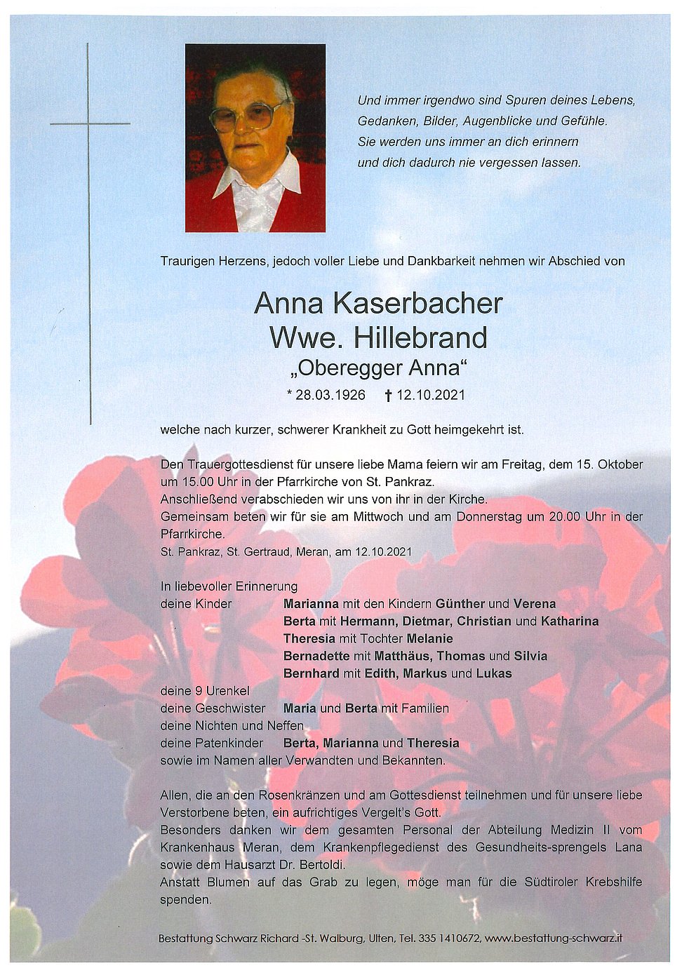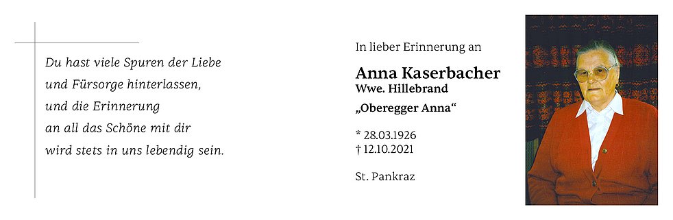 Den Trauergottesdienst für unsere liebe Mama feiern wir am Freitag, dem 15. Oktober um 15.00 Uhr in der Pfarrkirche von St. Pankraz.