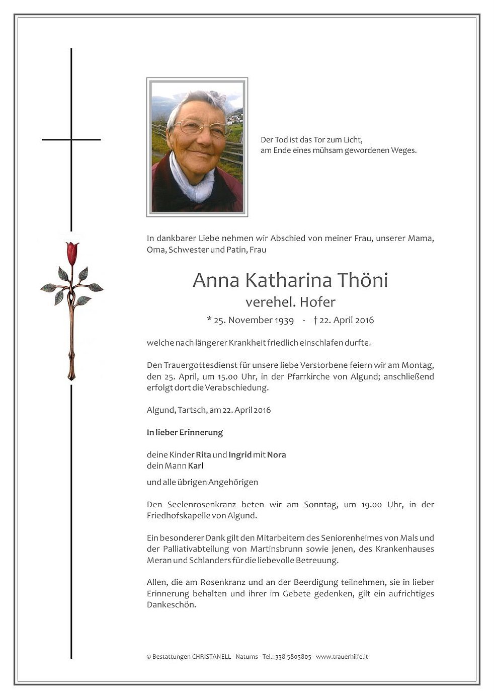 Den Trauergottesdienst für unsere liebe Verstorbene feiern wir am Montag, den 25. April, um 15.00 Uhr, in der Pfarrkirche von Algund; anschließend erfolgt dort die Verabschiedung.