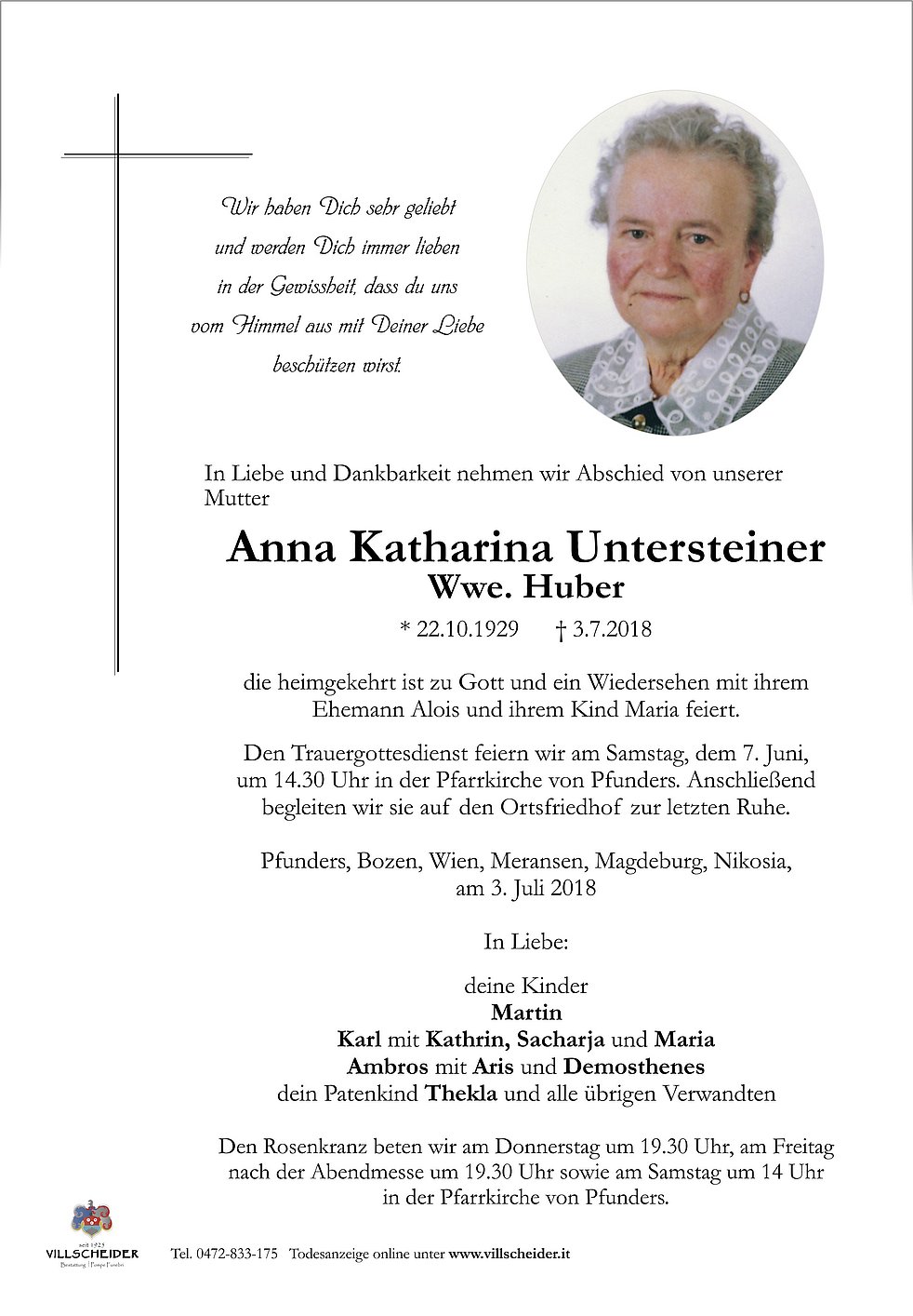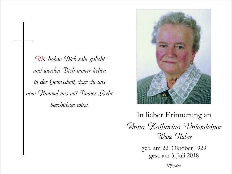 um 14.30 Uhr in der Pfarrkirche von Pfunders. Anschließend begleiten wir sie auf den Ortsfriedhof zur letzten Ruhe.