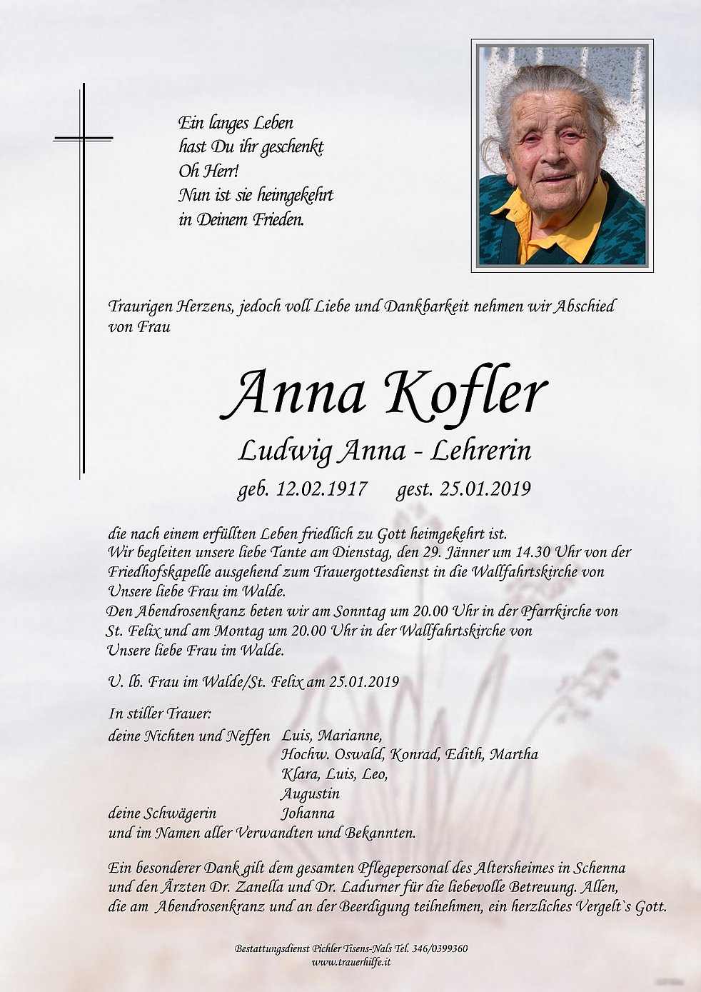 Wir begleiten unsere liebe Tante am Dienstag, den 29. Jänner um 14.30 Uhr von der