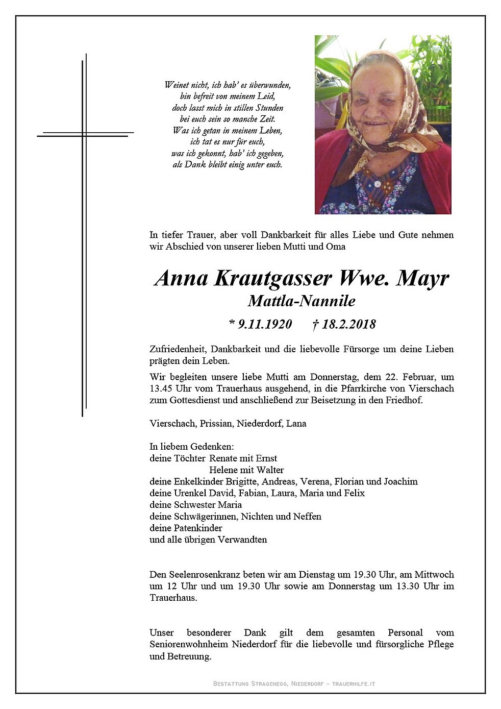 Wir begleiten unsere liebe Mutti am Donnerstag, dem 22. Februar, um 13.45 Uhr vom Trauerhaus ausgehend, in die Pfarrkirche von Vierschach zum Gottesdienst und anschließend zur Beisetzung in den Friedhof.