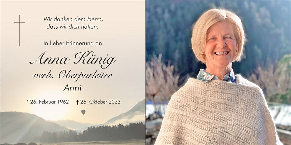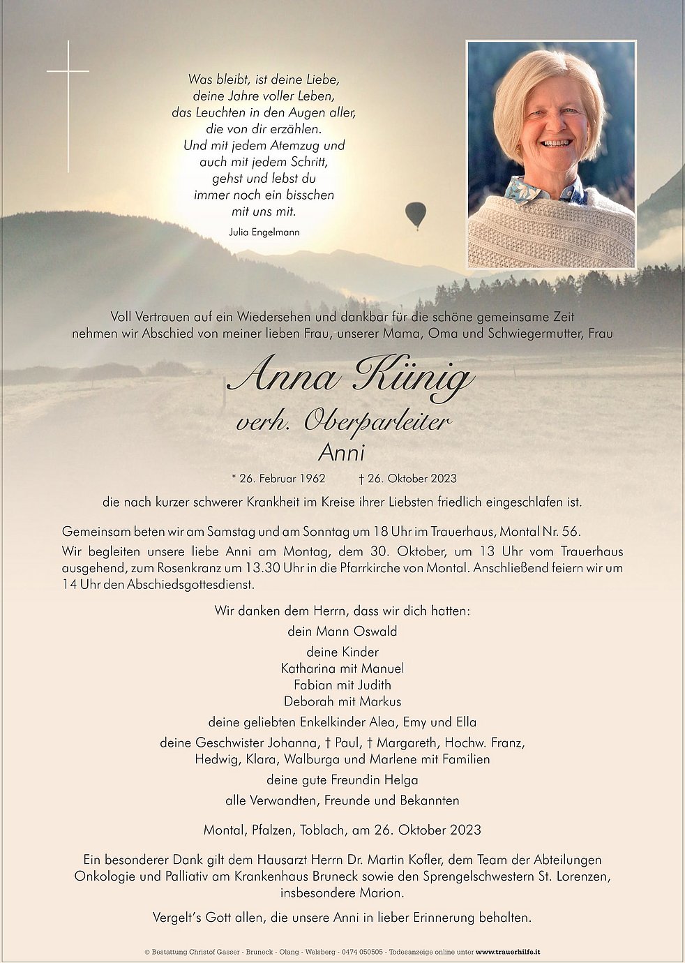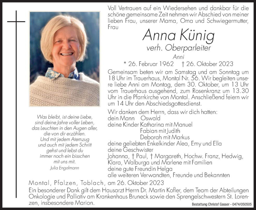 Wir begleiten unsere liebe Anni am Montag, dem 30. Oktober, um 13 Uhr vom Trauerhaus ausgehend, zum Rosenkranz um 13.30 Uhr in die Pfarrkirche von Montal.