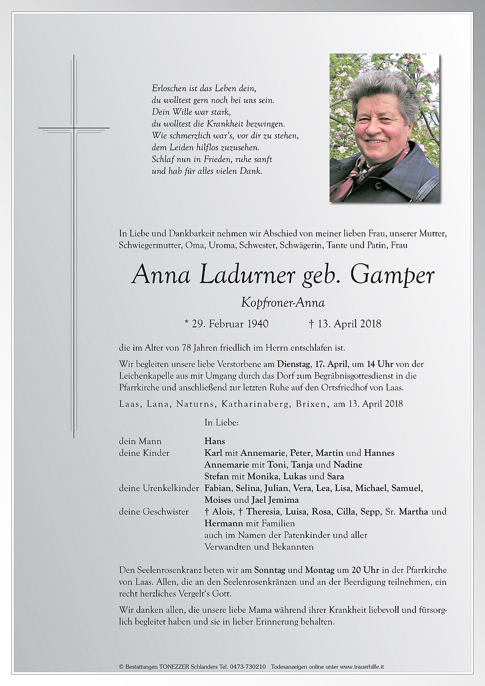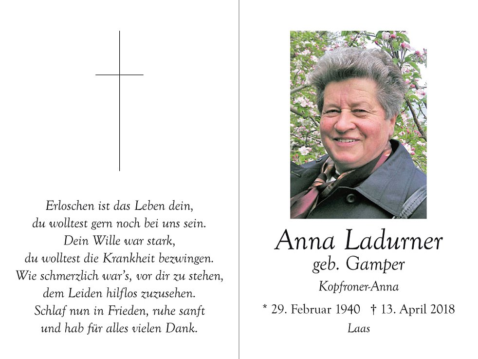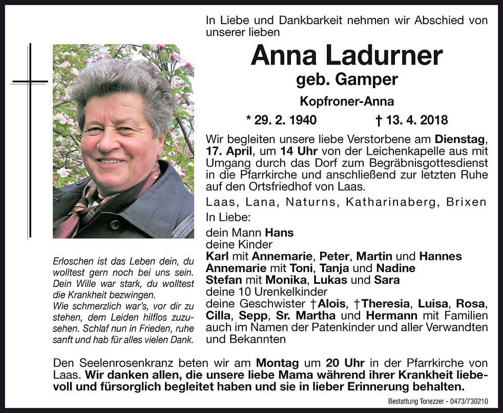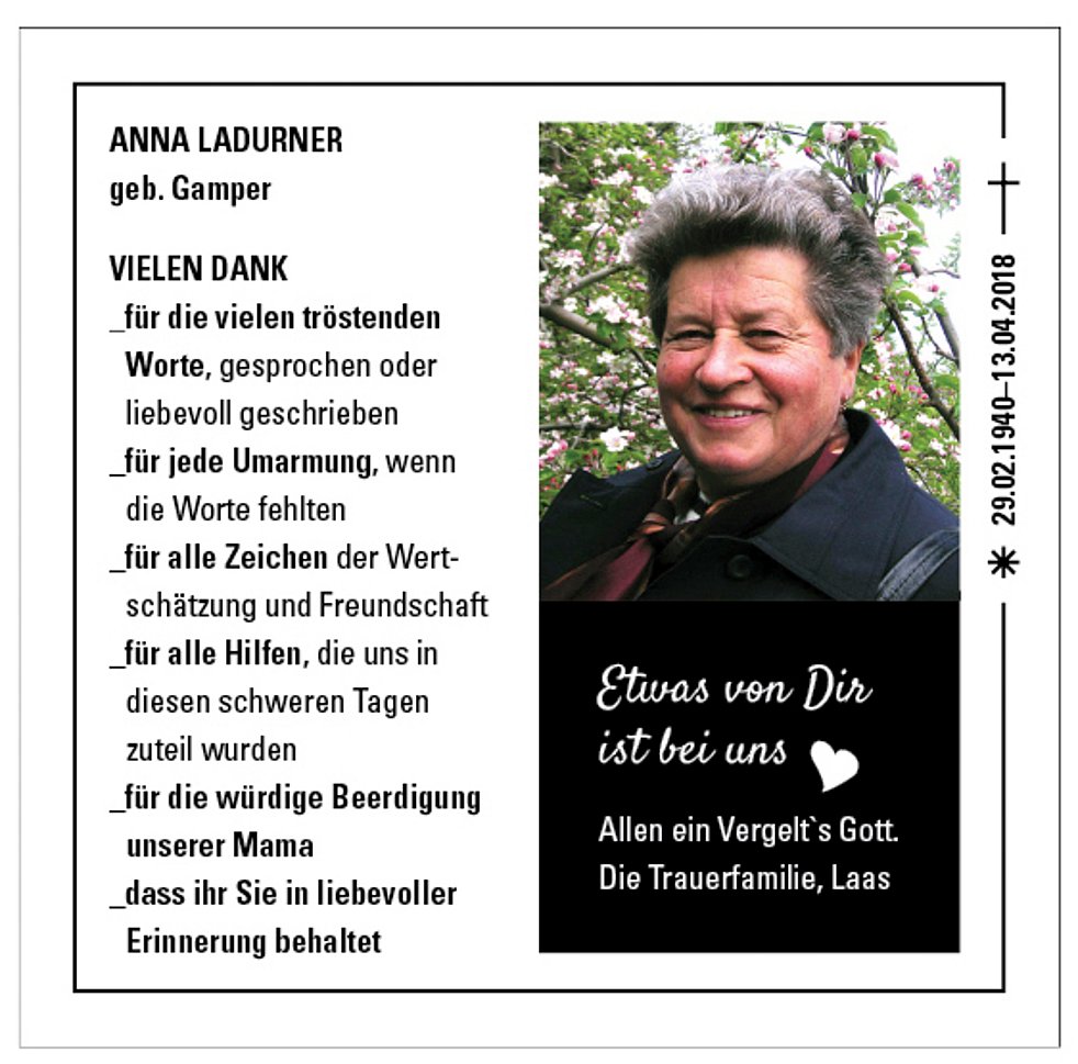 Wir begleiten unsere liebe Verstorbene am Dienstag, 17. April, um 14 Uhr von der Leichenkapelle aus mit Umgang durch das Dorf zum Begräbnisgottesdienst in die Pfarrkirche und anschließend zur letzten Ruhe auf den Ortsfriedhof von Laas.
