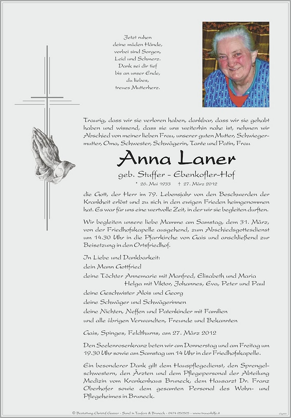 Wir begleiten unsere liebe Mamme am Samstag, dem 31. März, von der Friedhofskapelle ausgehend, zum Abschiedsgottesdienst um 14.30 Uhr in die Pfarrkirche von Gais und anschließend zur Beisetzung in den Ortsfriedhof.