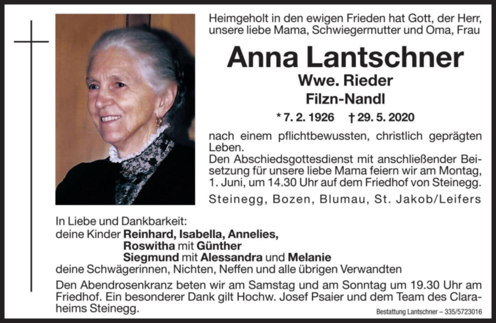 Den Abschiedsgottesdienst mit anschließender Beisetzung für unsere liebe Mama feiern wir am Montag 1. Juni 2020 um 14.30 Uhr auf dem Friedhof von Steinegg.