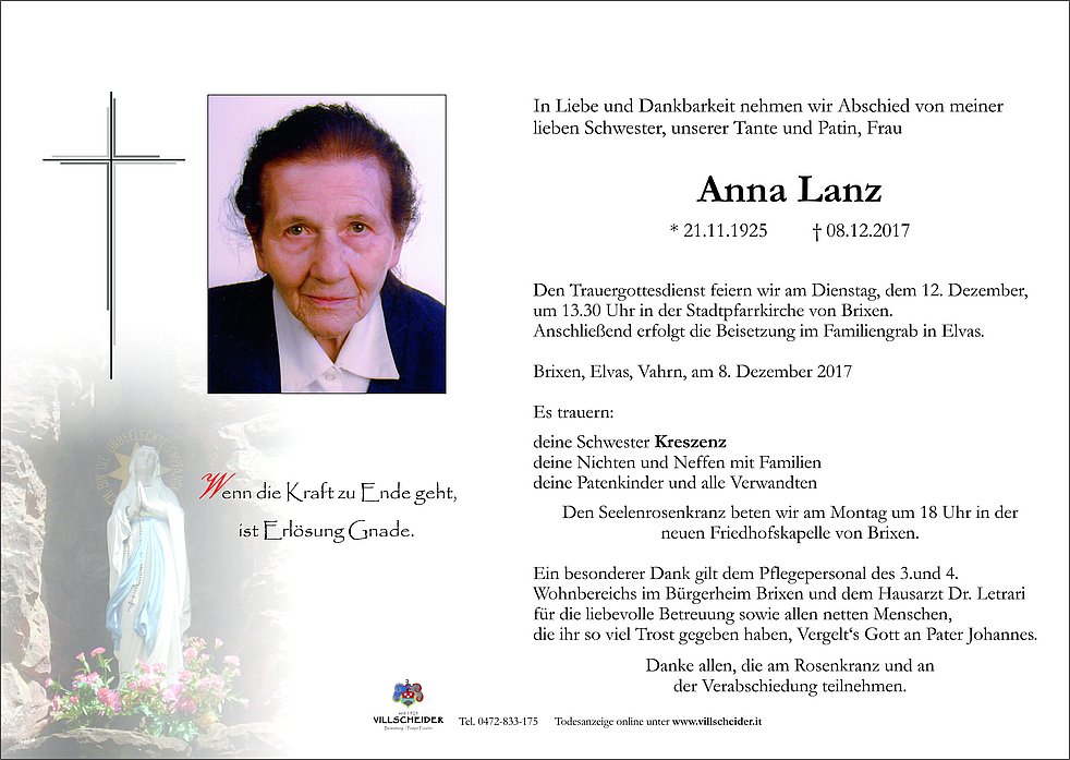 Ein besonderer Dank gilt dem Pflegepersonal des 3.und 4. Wohnbereichs im Bürgerheim Brixen und dem Hausarzt Dr. Letrari für die liebevolle Betreuung sowie allen netten Menschen,