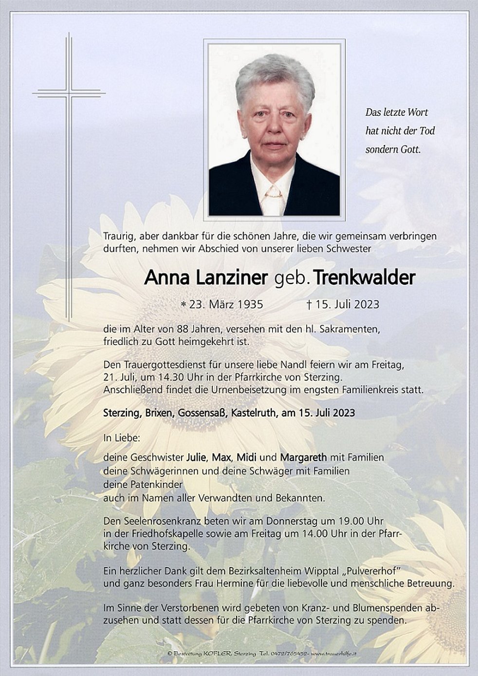 Den Trauergottesdienst für unsere liebe Nandl feiern wir am Freitag, 21. Juli, um 14.30 Uhr in der Pfarrkirche von Sterzing. Anschließend findet die Urnenbeisetzung im engsten Familienkreis statt.