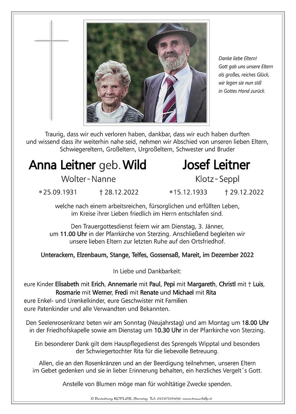 Den Trauergottesdienst feiern wir am Dienstag, 3. Jänner, um 11.00 Uhr in der Pfarrkirche von Sterzing. Anschließend begleiten wir unsere lieben Eltern zur letzten Ruhe auf den Ortsfriedhof.