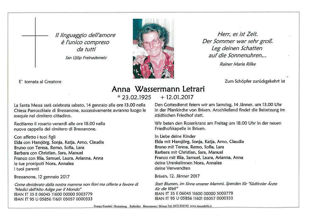 Den Gottesdienst feiern wir am Samstag, 14 Jänner, um 13.00 Uhr in der Pfarrkirche von Brixen. Anschließend findet die Beisetzung im städtischen Friedhof statt.