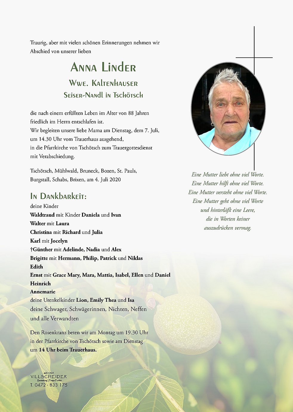Liebe Brigitte, lieber Philipp, Patrick und Niklas - all unser Mitgefühl begleitet euch in dieser Zeit des Abschieds von eurer lieben Mama und Oma. Aufrichtige Anteilnahme Elisabeth, Helmut, Daniel und Vanessa Nitz