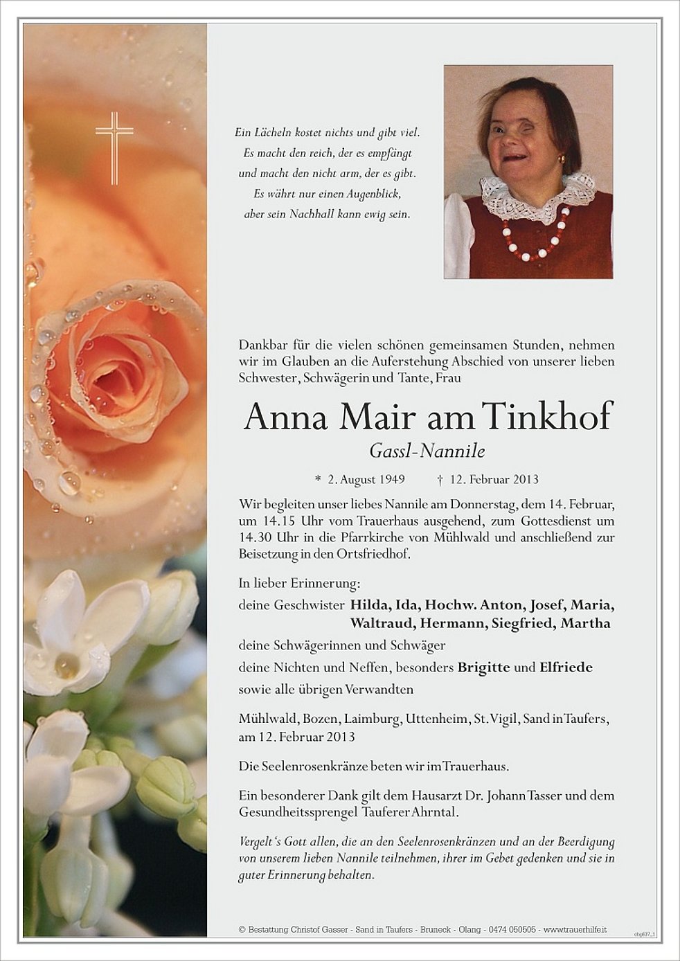 Wir begleiten unser liebes Nannile am Donnerstag, dem 14. Februar, um 14.15 Uhr vom Trauerhaus ausgehend, zum Gottesdienst um 14.30 Uhr in die Pfarrkirche von Mühlwald und anschließend zur Beisetzung in den Ortsfriedhof.