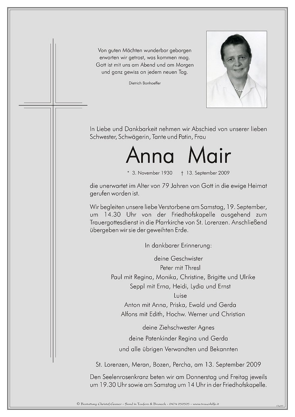 Wir begleiten unsere liebe Verstorbene am Samstag, 19. September, um 14.30 Uhr von der Friedhofskapelle ausgehend zum Trauergottesdienst in die Pfarrkirche von St. Lorenzen. Anschließend übergeben wir sie der geweihten Erde.