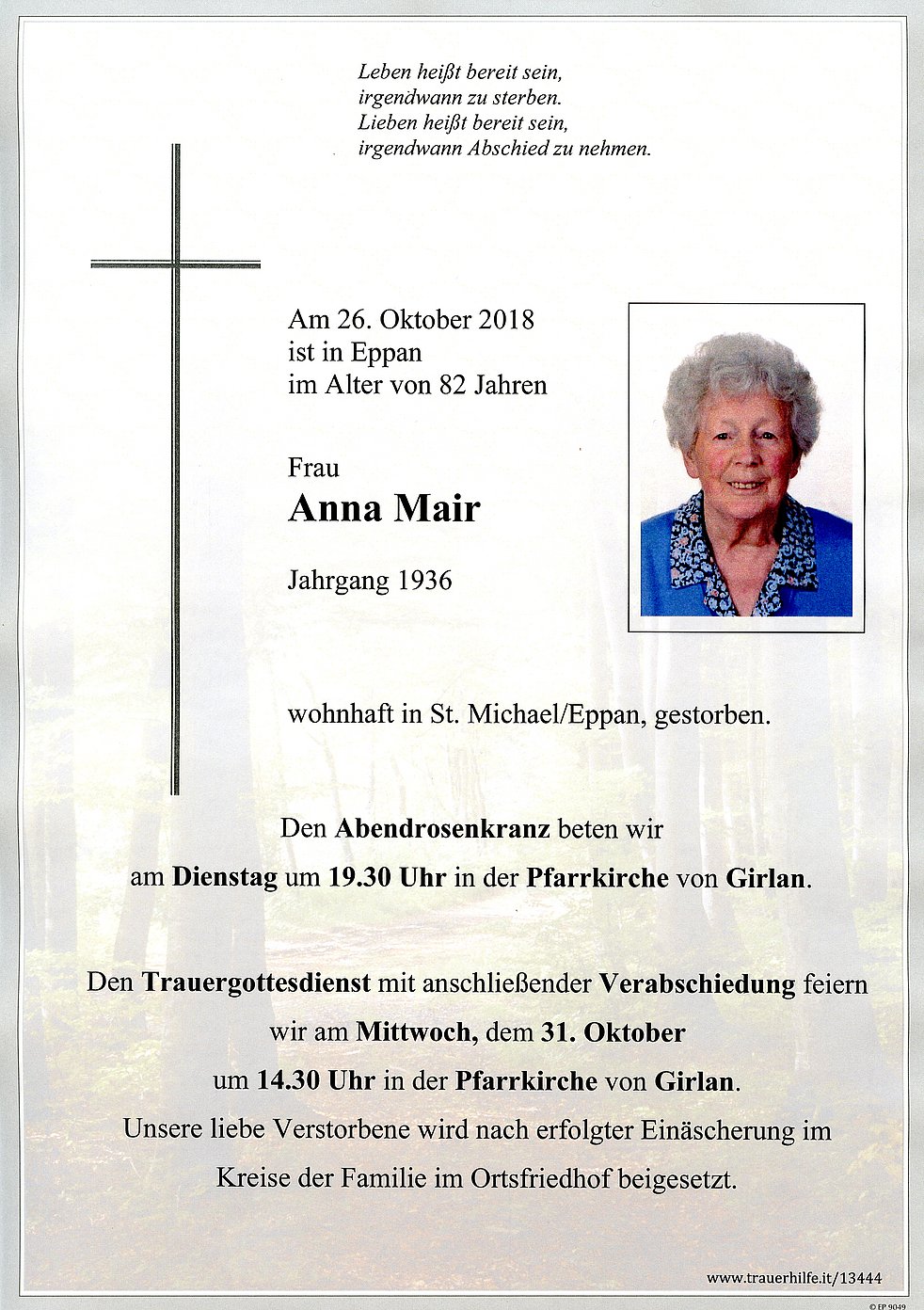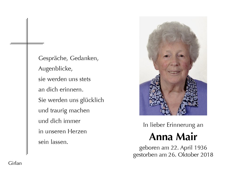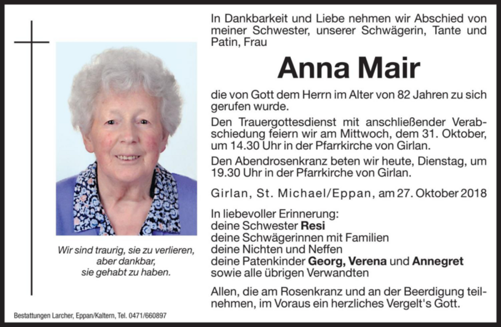 Den Trauergottesdienst mit anschließender Verabschiedung feiern wir am Mittwoch, dem 31. Oktober um 14.30 Uhr in der Pfarrkirche von Girlan.