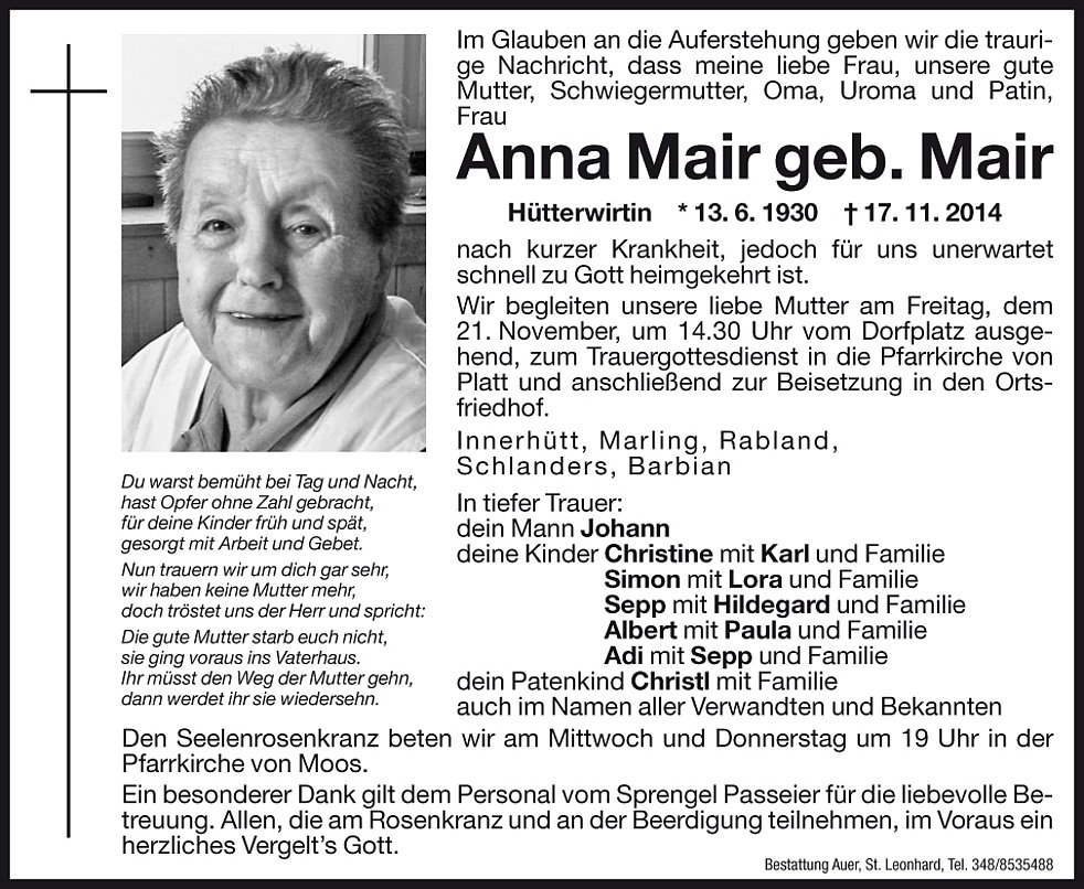 Wir begleiten unsere liebe Mutter am Freitag, dem 21. November, um 14.30 Uhr vom Dorfplatz ausgehend, zum Trauergottesdienst in die Pfarrkirche von Platt und anschließend zur Beisetzung in den Ortsfriedhof.