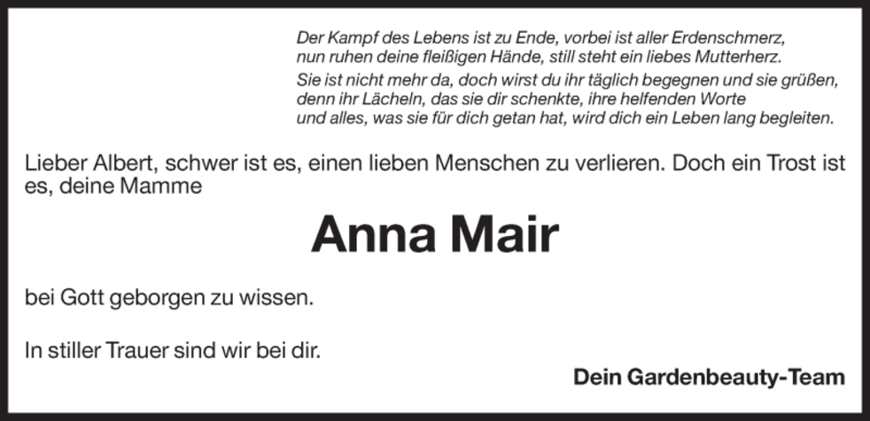 Im Glauben an die Auferstehung geben wir die traurige Nachricht, dass meine liebe Frau, unsere gute Mutter, Schwiegermutter, Oma, Uroma und Patin, Frau