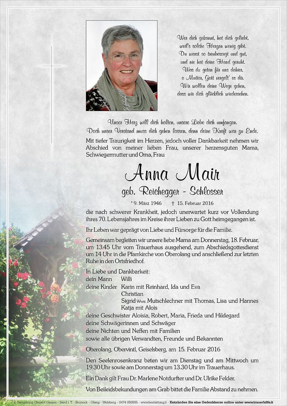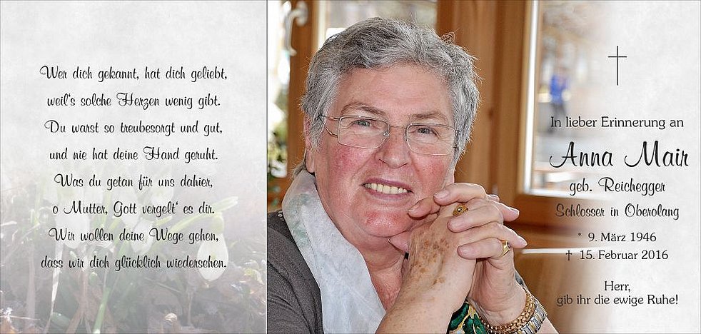 Gemeinsam begleiten wir unsere liebe Mama am Donnerstag, 18. Februar, um 13.45 Uhr vom Trauerhaus ausgehend, zum Abschiedsgottesdienst um 14 Uhr in die Pfarrkirche von Oberolang und anschließend zur letzten Ruhe in den Ortsfriedhof.