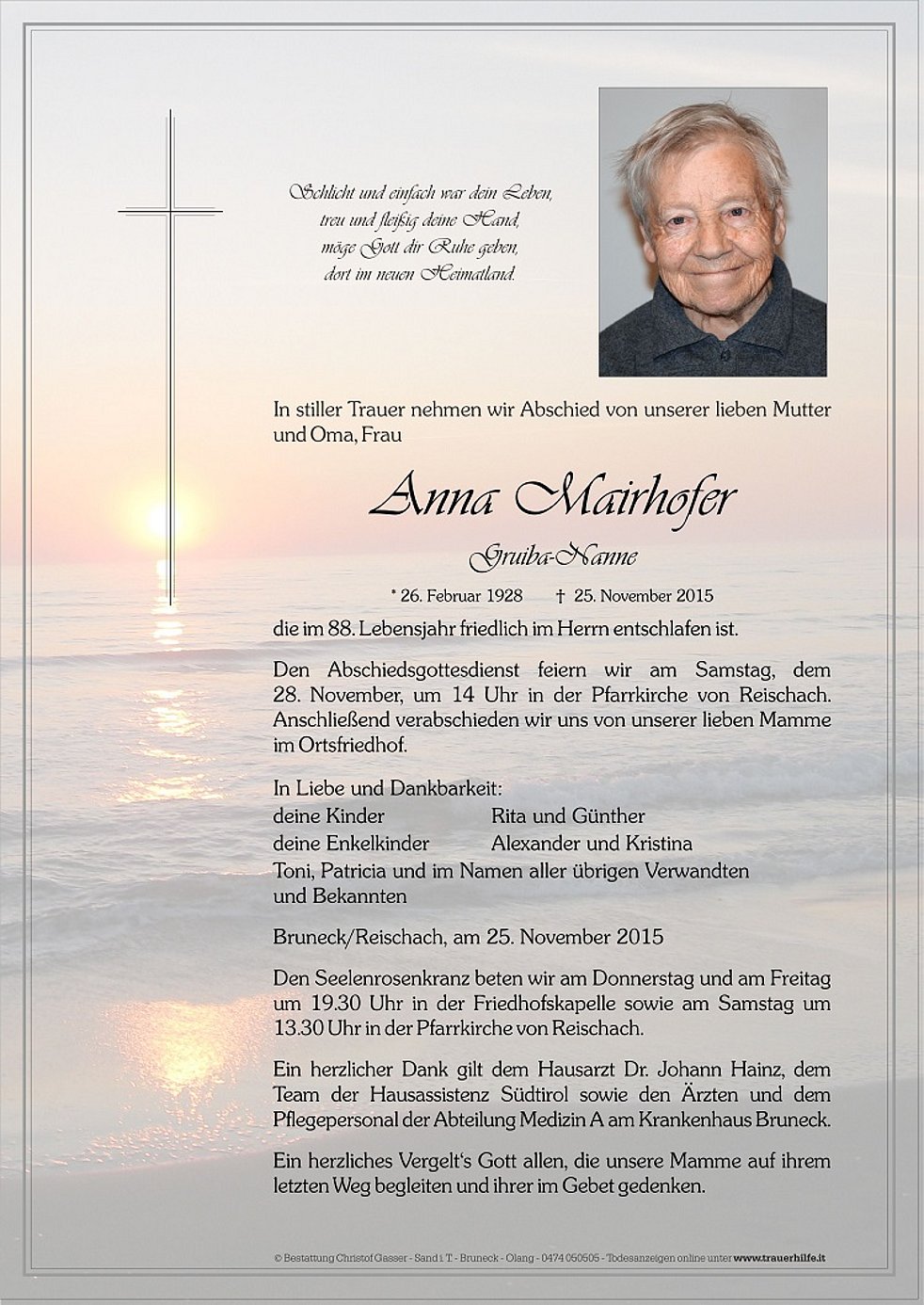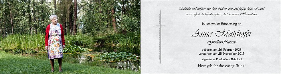 28. November, um 14 Uhr in der Pfarrkirche von Reischach. Anschließend verabschieden wir uns von unserer lieben Mamme im Ortsfriedhof.