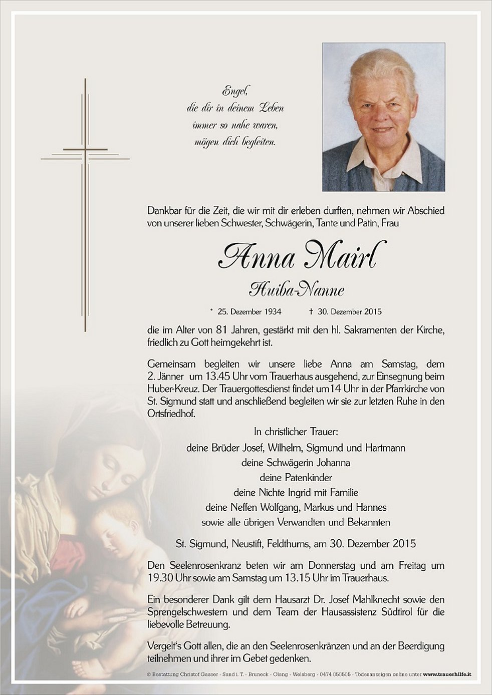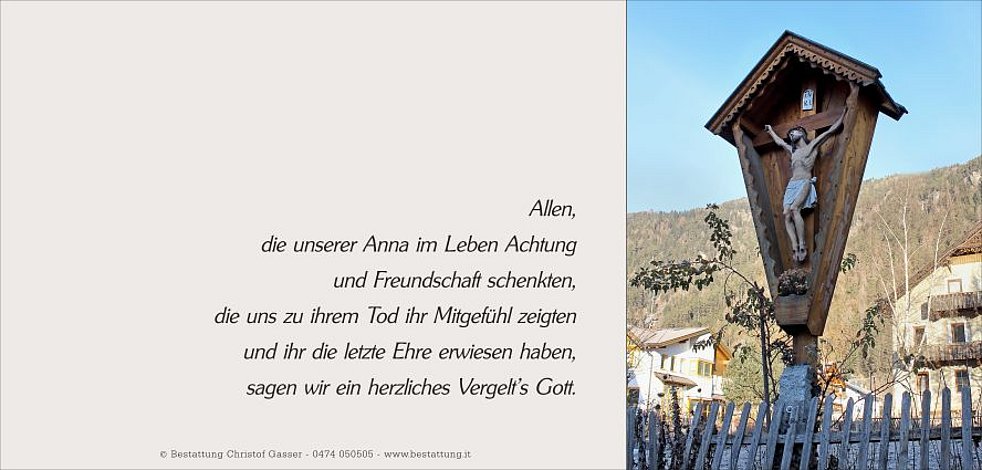 Ein besonderer Dank gilt dem Hausarzt Dr. Josef Mahlknecht sowie den Sprengelschwestern und dem Team der Hausassistenz Südtirol für die liebevolle Betreuung.