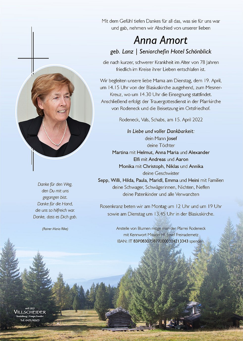 Aufrichtiges und herzliches Beileid zum Tode deiner geliebten Frau und herzensguten Mutter Anna. Seit fast 40 Jahren kennen und schätzten wir die Verstorbene bei unserem jährlichen Urlaub. Ihr liebevolles Umsorgen der Gäste, ob beim herrichten des Frühstücksbuffets, bei den wöchentlichen Wandertouren oder beim abendlichen Empfang der Hausgäste, immer war Sie auf das Wohl ihrer Gäste bedacht. Wir werden ihre von Herzen kommende Freundlichkeit und Art und Weise nie vergessen. Sie wird uns bei unseren schönen Urlaubstagen in Südtirol fehlen. Danke für die wunderbare Zeit, die wir mit ihr verbringen durften. Ruhe nun in Gottes Frieden.
