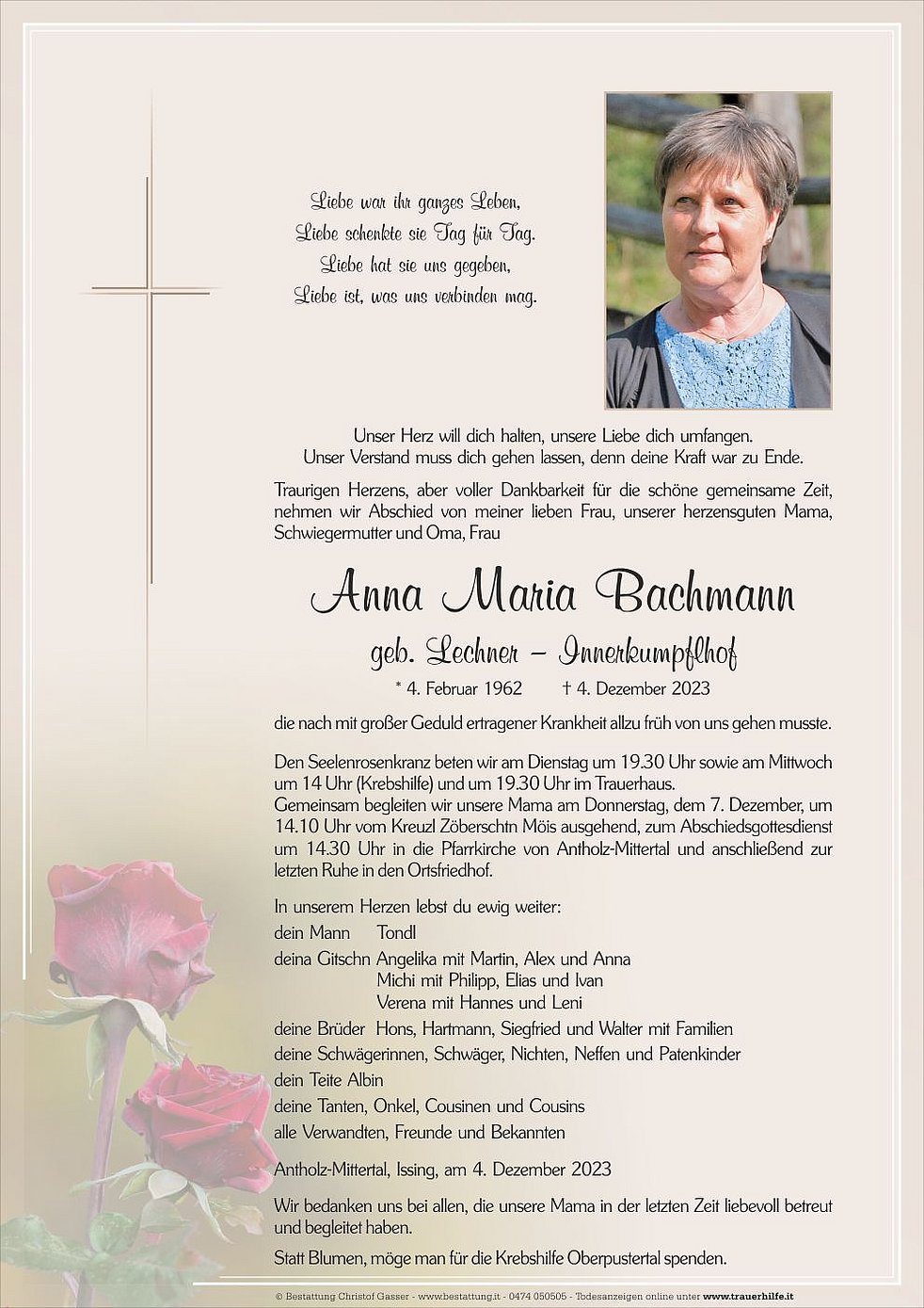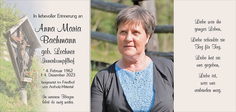 Gemeinsam begleiten wir unsere Mama am Donnerstag, dem 7. Dezember, um 14.10 Uhr vom Kreuzl Zöberschtn Möis ausgehend, zum Abschiedsgottesdienst um 14.30 Uhr in die Pfarrkirche von Antholz-Mittertal und anschließend zur letzten Ruhe in den Ortsfriedhof.