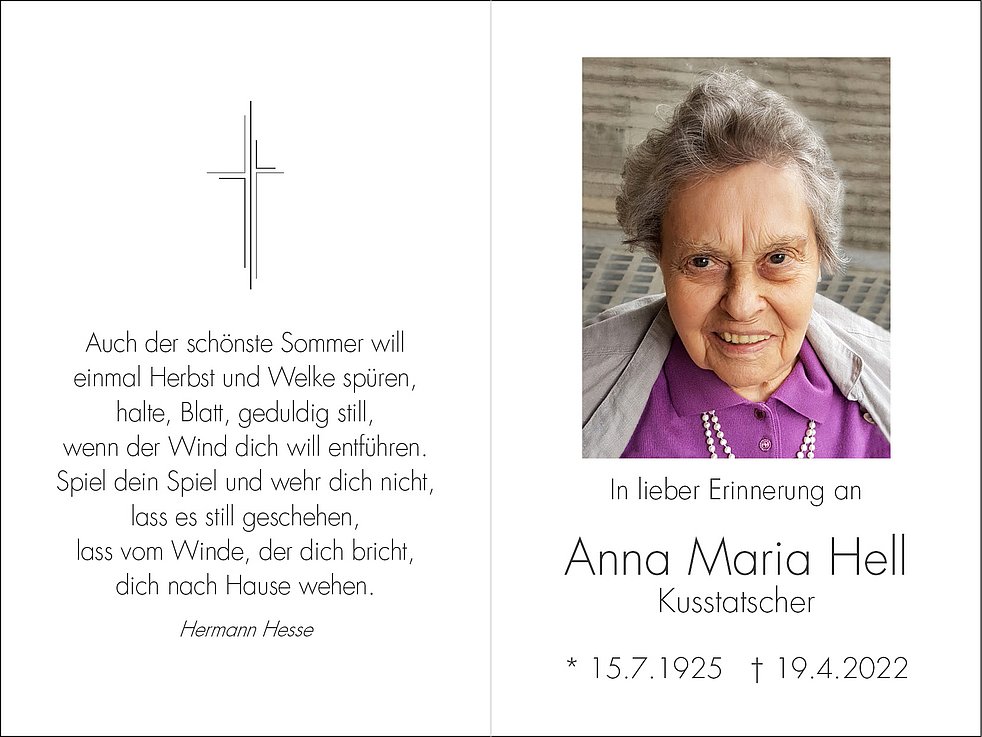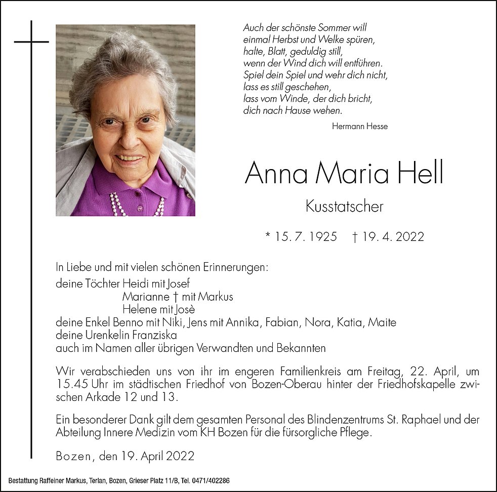 Wir verabschieden uns von ihr im engeren Familienkreis am Freitag, 22. April, um 15.45 Uhr im städtischen Friedhof von Bozen Oberau hinter der Friedhofskapelle zwischen Arkade 12 und 13.