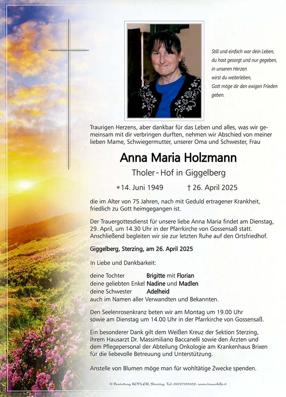 Der Trauergottesdienst für unsere liebe Anna Maria findet am Dienstag, 29. April, um 14.30 Uhr in der Pfarrkirche von Gossensaß statt. Anschließend begleiten wir sie zur letzten Ruhe auf den Ortsfriedhof.