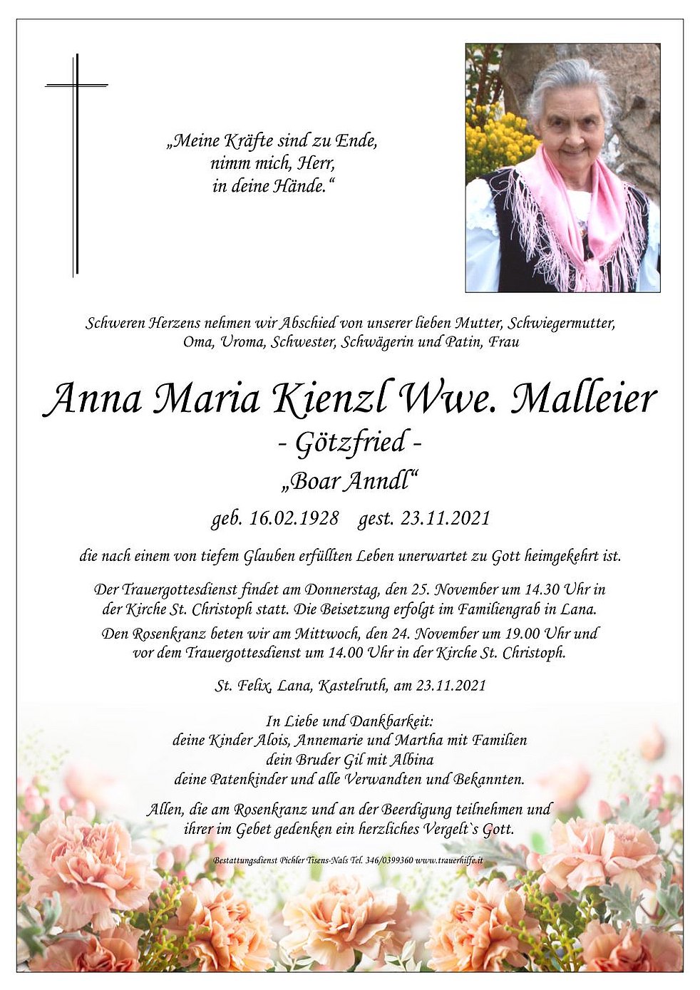 der Kirche St. Christoph statt. Die Beisetzung erfolgt im Familiengrab in Lana.