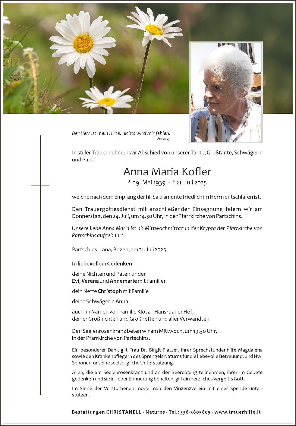 Den Trauergottesdienst mit anschließender Einsegnung feiern wir am Donnerstag, den 24. Juli, um 14.30 Uhr, in der Pfarrkirche von Partschins.