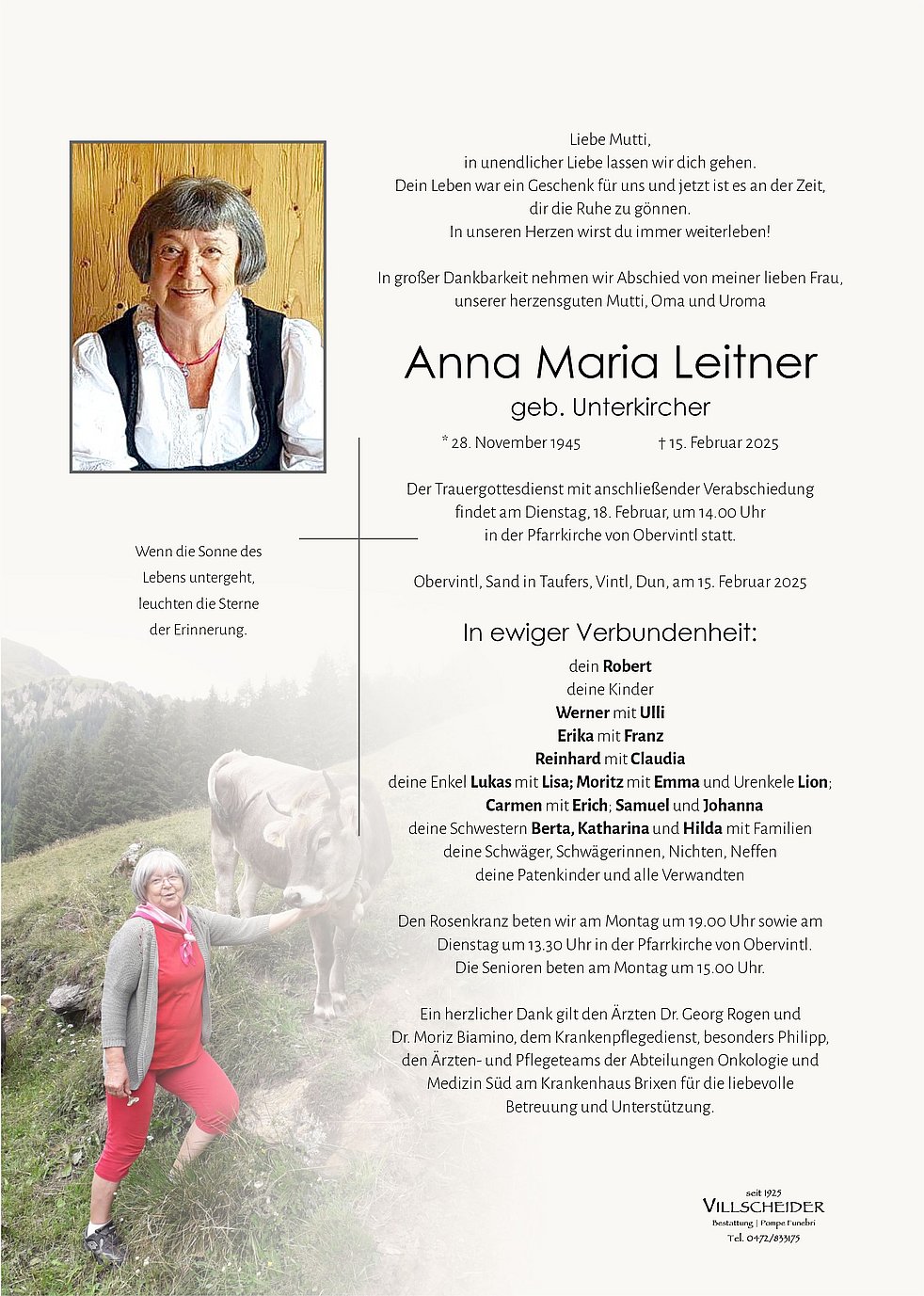 Unvergessen die wunderschöne Zeit bei Euch beim Baurnfeld. Immer hätte ich das Gefühl willkommen zu sein. Viele Male haben wir gelacht geweint gefeiert und für mich ward Ihr meine zweite Familie und Zuhause. Auch meiner Mame warst du Annemarie eine liebe und wertvolle Freundin die ihr in schwierigen Zeiten eine Stütze war.Von Herzen danke dafür.Lieber Robert Werner Erika und Reinhard Eure Mutti war eine wundervolle Frau und wird immer einen besonderen Platz in meinem Herzen haben.Ich fühle sehr mit Euch und umarme Euch. Eppacher Silvia!