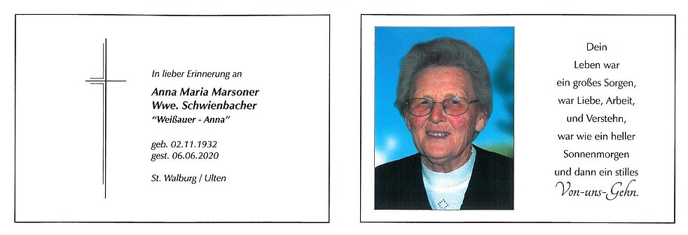 Eine liebe Frau, Mama und wir alle haben uns immer gefreut, wenn sie auf Besuch war oder wir bei ihr - leider viel zu selten! Sie strahlte Güte aus. Mein Beileid der engsten Familie und allen Ultner Verwandten!
