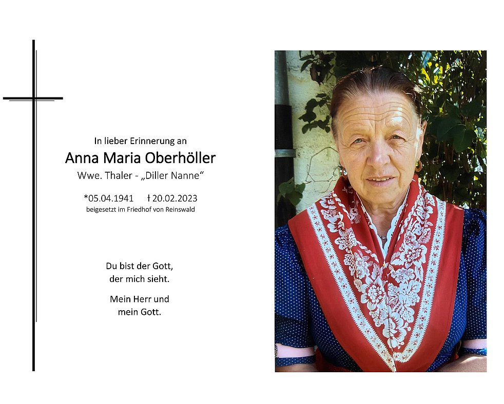Der Trauergottesdienst findet am Donnerstag, den 23. Februar um 14:30 Uhr in der Pfarrkirche Reinswald statt.
