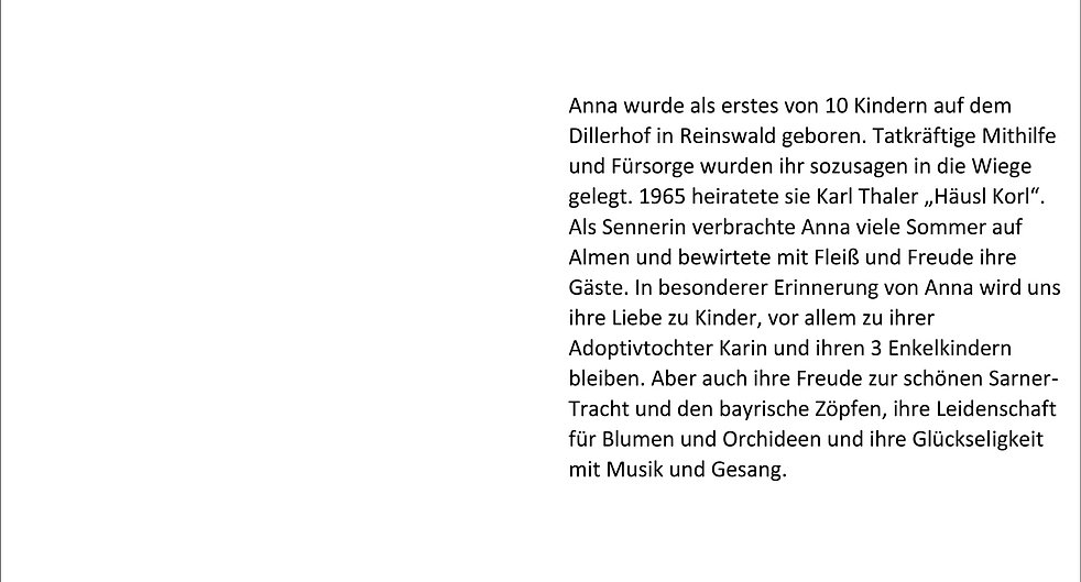 Besonderer Dank gilt Maria Stofner, ihrem Bruder Josef und dem Pflegeheim der Sarner Stiftung für die liebevolle Betreuung.