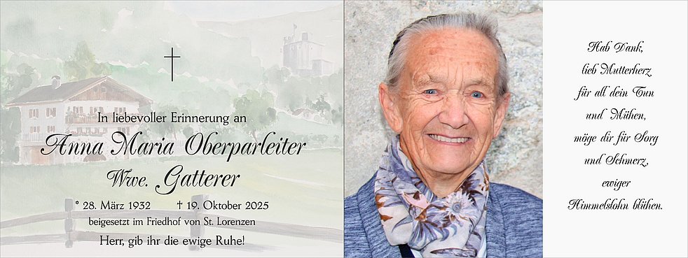 Vergelt’s Gott allen, die an den Rosenkränzen sowie an der Beerdigung teilnehmen und unsere liebe Mutter in guter Erinnerung behalten.
