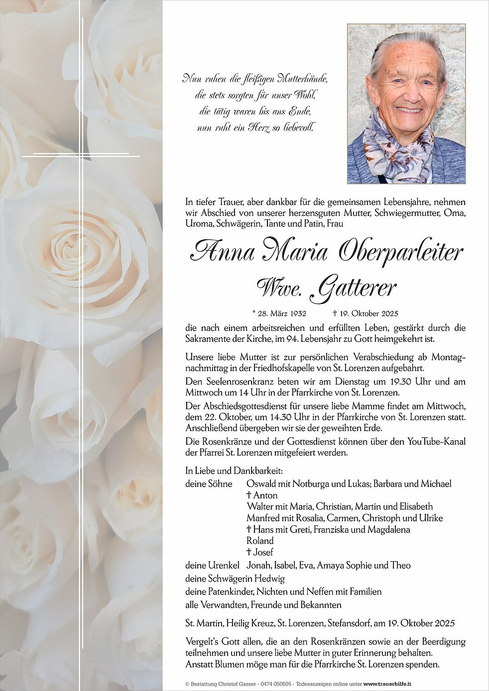 Der Abschiedsgottesdienst für unsere liebe Mamme findet am Mittwoch, dem 22. Oktober, um 14.30 Uhr in der Pfarrkirche von St. Lorenzen statt. Anschließend übergeben wir sie der geweihten Erde. Die Rosenkränze und der Gottesdienst können über den YouTube-Kanal der Pfarrei St. Lorenzen mitgefeiert werden.